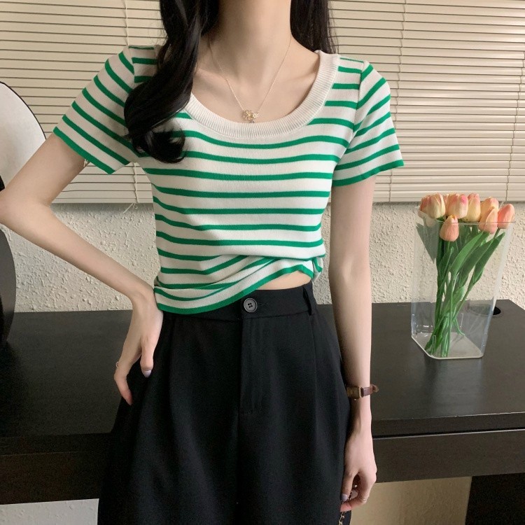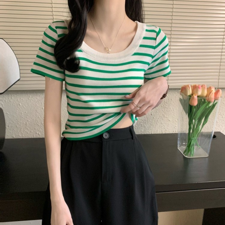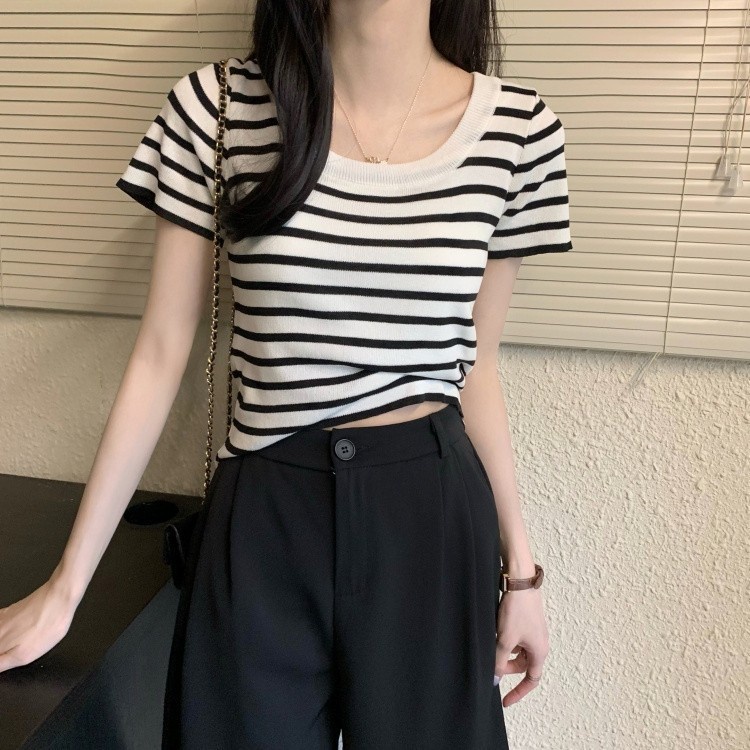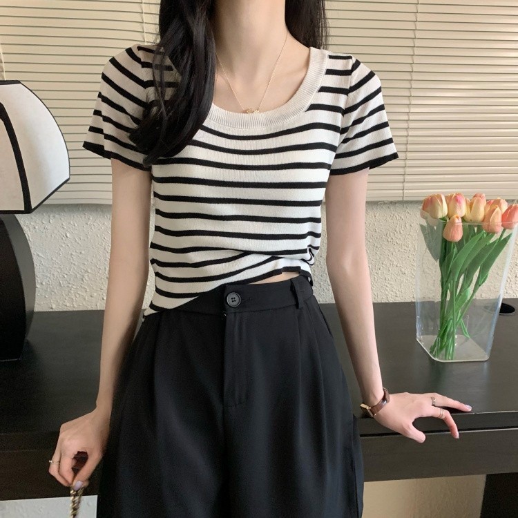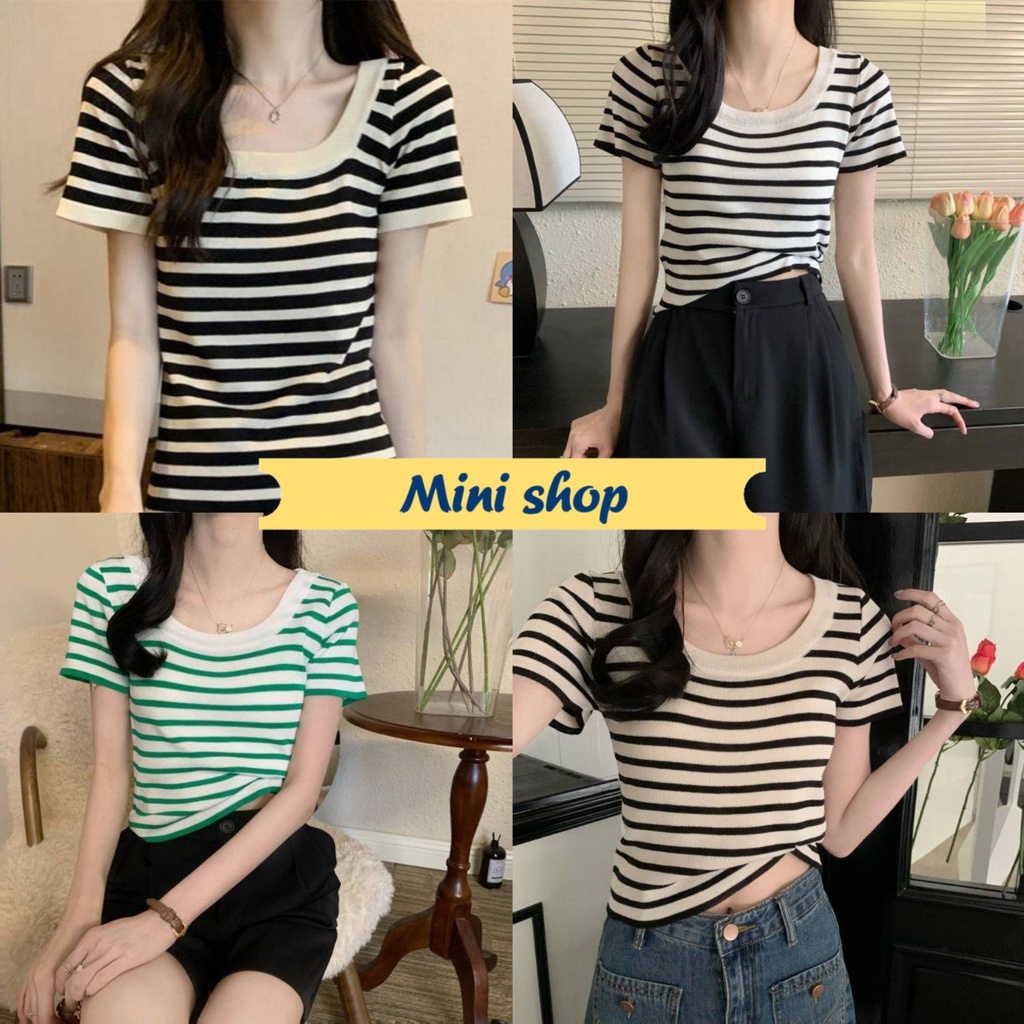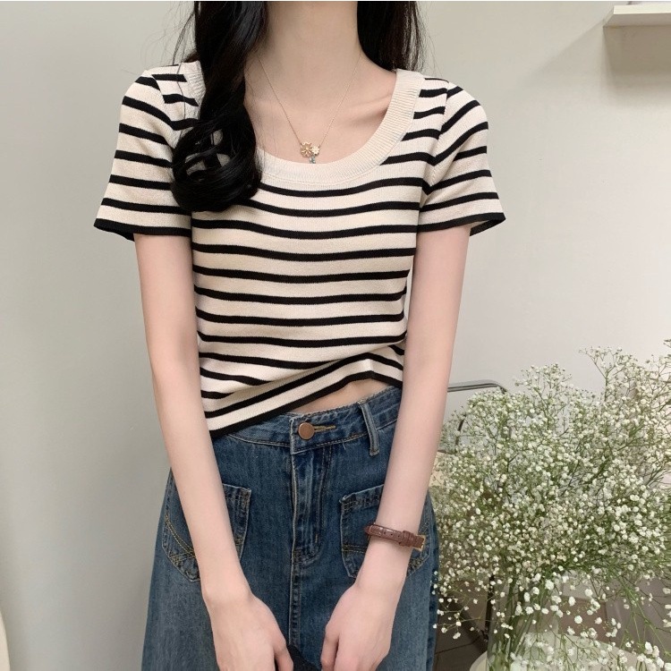 Mini shop🌸พร้อมส่ง🌸 (88618) เสื้อไหมพรมแขนสั้น คอกลม ดีเทลลายทางคิ้วๆ เสื้อยืดผู้หญิง -C
