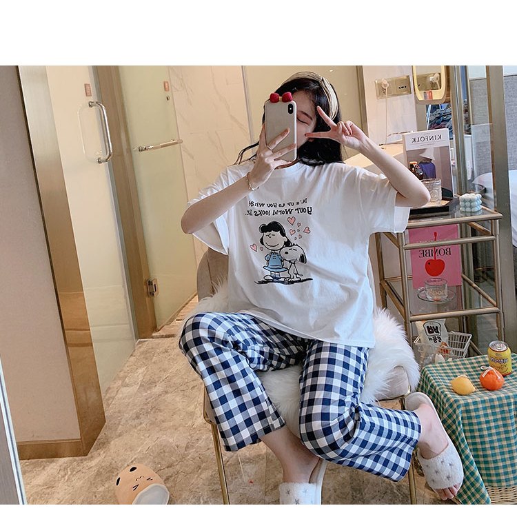ชุดนอนแขนสั้น ลาย ชุดนอนลายกาตูน ชุดนอนพิมพ์ลายการ์ตูน เสื้อยืดคอกลม+กางเกง BE