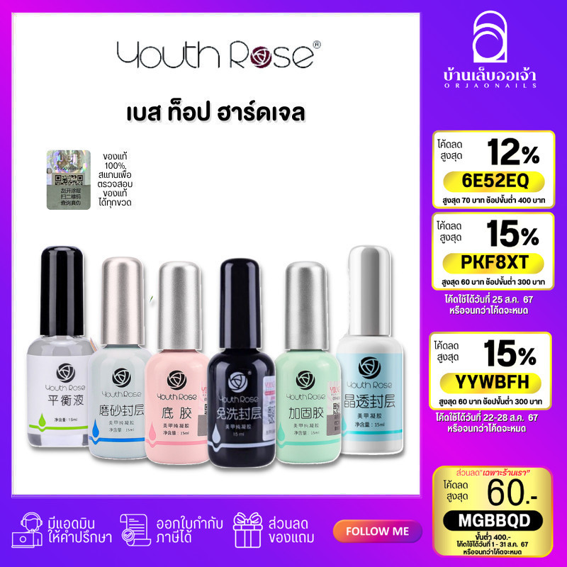 Youth Rose เบสท็อป​ กุหลาบ ฮาร์ดเจล ของแท้100% Top Coat , Base Coat , Hard Gel ปริมาณ 15 ml - เบสโค้ท รองพื้นสีเจล / Base Coat / ขวดสีชมพู ใช้สำหรับทารองพื้นก่อนทาสีเจล เพื่อการยึดเกาะของหน้าเล็บและสีเจล ช่วยให้สีติดทนนาน ไม่ทำให้หลุดร่อนได้งาย - ท็อปเงา เคลือบใส / Top coat / ขวดสีดำ ท็อปโค