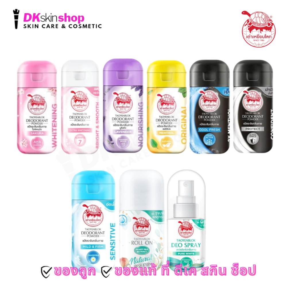 เต่าเหยียบโลก แป้งทาระงับกลิ่น 7 สูตร 1. สีเหลือง ดั้งเดิม ORIGINAL กลิ่นเมนทอล ขนาด 22 กรัม เลขที่จดแจ้ง : 10-1-6400014474 2. สีชมพู กลิ่น WHITENING ซากุระ ขนาด 22 กรัม เลขที่จดแจ้ง : 10-1-6400014604 3. สีม่วง กลิ่น NOURISHING ลาเวนเดอร์ ขนาด 22 กรัม เลขที่จดแจ้ง : 10-1-640001