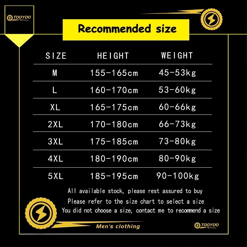 ... ความสูง: 155 ซม. - 165 ซม. น้ำหนัก: 45 กก. - 53 กก. ขนาดที่แนะนำ [M] ความสูง: 160 ซม. -170 ซม. น้ำหนัก: 53 กก. -60 กก. ขนาดที่แนะนำ [L] ความสูง: 165 ซม. - 175 ซม. น้ำหนัก: 60 กก. - 66 กก. ขนาดที่แนะนำ [XL] ความสูง: 170 ซม. -180 ซม. น้ำหนัก: 66 กก. -73 กก. ขนาดที่แนะนำ [2XL] ความสูง: 175 ซม. - 185 ซม. น้ำหนัก: 73 กก. -80 กก. ขนาดที่แนะนำ [3XL] ความสูง: 180 ซม. -190 ซม. น้ำหนัก: 80 กก. -90 กก. ขนาดที่แนะนำ [4XL] ความสูง: 185 ซม. - 195 ซม. น้ำหนัก: 90 กก. - 100 กก. ขนาดที่แนะนำ [5XL]