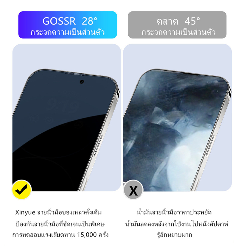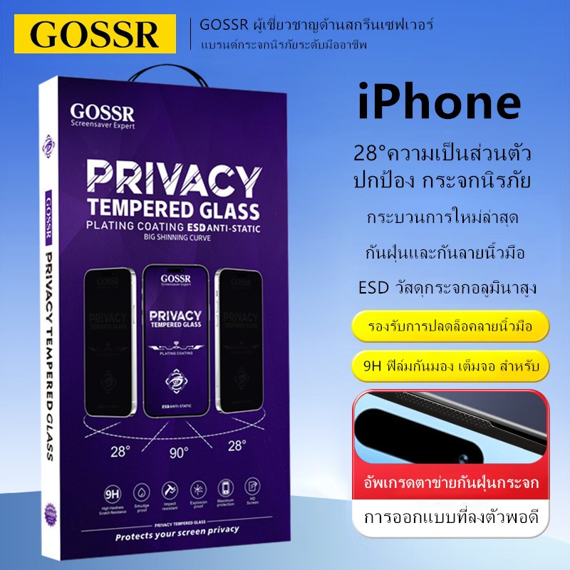 GOSSRฟิล์มกระจกเต็มจอ Privacy กันเผือก สำหรับ iPhone 16 ProMax 15 16Pro 15Plus 14ProMax 14 13 Pro 14Plus 12 11 ProMax XR