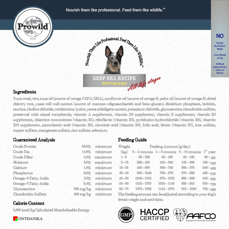 ... อบ •วัตถุดิบจากธรรมชาติ ✔️ช่วยลดคราบน้ำตา ปลอดภัยต่อผิวแพ้ง่ายและกระเพาะอาหาร •ปราศจากกลูเตน ✔️ช่วยให้สุนัขได้รับสารอาหารครบถ้วน มีสุขภาพดี ป้องกันโรคแพ้กลูเตน •กรดไขมันโอเมก้า ✔️กรดไขมันโอเมก้า 6 และ 3 บำรุงสุขภาพผิวหนังและเส้นขนให้เงางาม •เลซิทิน ✔️บำรุงระบบประสาท กระตุ้นความจำและความสามารถในการเรียนรู้เพื่อฝึกฝน •ทอรีน ✔️มีส่วนช่วยในการทำงานของหัวใจและหลอดเลือดหัวใจให้ปกติ •ซิ้งค์และโฟลิค ✔️มีส่วนช่วยในการทำงานของระบบสืบพันธุ์เพื่ออสุจิที่แข็งแรงและช่วยเตรียมความพร้อมสำหรับการตั้งครรภ์ที่ดี •รากชิโครี ✔️แหล่งของเส้นใยพรีไบโอติกซึ่งเป็นอาหารสำหรับแบคทีเรียโพรไบโอติกที่เป็นประโยชน์ในระบบย่อยอาหาร •สารสกัดยัคค่าซิดิเจอร่า ✔️ช่วยลดปริมาณของมูล กลิ่นมูล กลิ่นตัว และกลิ่นปากสุนัข •กลูโคซามีนและคอนดรอยติน ✔️ ช่วยลดการอักเสบที่ข้อสะโพกและข้อต่อ 📌ส่วนผสม แกะป่น ข้าว น้ำมันปลาทูน่า (แหล่งของโอเมก้า 3 อีพีเอ/ดีเอสเอ) น้ำมันเมล็ดทานตะวัน (แหล่งของโอเมก้า 6) น้ำมันปาล์ม (แหล่งของโอเมก้า 9) รากชิโครี่ สารสกัดผนังเซลล์ยีต์ (แหล่งของแมนแนน-โอลิโกแซคคาไรด์และเบต้า-กลูแคน) ไดแคลเซียมฟอสเฟต เลซิติน ทอรีน โคลีน คลอไรด์ เมไทโอนีน ไลซีน สารสกัดยัคค่าซิดิเจอร่า โพแทสเซียมคลอไรด์ กลูโคซามีน คอนดรอยติน ถนอมคุณภาพอาหารสัตว์ด้วยวิตามินซีและวิตามินอี วิตามิน เอ วิตามิน ดี3 วิตามิน อีวิตามิน เค3 ไทอามีน (วิตามิน บี1) ไรโบฟลาวิน (วิตามิน บี2) ไพริดอกซิน (วิตามิน บี6) วิตามิน บี12 กรดแพนโททีนิก (วิตามิน บี5) กรดนิโคตินิก (วิตามิน บี3) กรดโฟลิก ไบโอติน (วิตามิน บี7) เหล็ก ทองแดง แมงกานีส สังกะสี ซีลีเนียม ❌ไม่มีส่วนผสมของ ไก่/ผลพลอยได้จากสัตว์ปีก (ปาก หัว เล็บ เลือด เครื่องใน) ❌ไม่มีส่วนผสมของ ข้าวโพด ข้าวสาลี หรือถั่วเหลือง ❌ไม่มีส่วนผสมของ สารกันบูด สี หรือกลิ่นสังเคราะห์ 🔅คุณค่าโภชนาการ โปรตีน ไม่น้อยกว่า ร้อยละ 26.0 ไขมัน ไม่น้อยกว่า ร้อยละ 14.0 กาก ไม่มากกว่า ร้อยละ 4.5 ความชื้น ไม่มากกว่า ร้อยละ 8.5 แคลเซียม ไม่น้อยกว่า ร้อยละ 1.2 ฟอสฟอรัส ไม่น้อยกว่า ร้อยละ 0.9 วิตามิน อี ไม่น้อยกว่า 350 ไอยูต่อกิโลกรัม กรดไขมันโอเมก้า 6 ไม่น้อยกว่า ร้อยละ 3.5 กรดไขมันโอเมก้า 3 ไม่น้อยกว่า ร้อยละ 0.4 ทอรีน ไม่น้อยกว่า ร้อยละ 0.2 กลูโคซามีน ไม่น้อยกว่า 500 มิลลิกรัมต่อกิโลกรัม คอนดรอยติน ไม่น้อยกว่า 400 มิลลิกรัมต่อกิโลกรัม 🔻พลังงานที่นำไปใช้ได้ 3,500 กิโลแคลอรี่ต่อกิโลกรัม ➖➖➖➖➖➖➖➖➖➖➖➖➖➖➖➖➖➖➖➖➖➖➖➖➖➖➖➖ 🐟🌾โปรไวลด์ ดีพ ซี สูตรปลาทูน่า สำหรับสุนัขทุกสายพันธุ์/ทุกช่วงวัย ✅