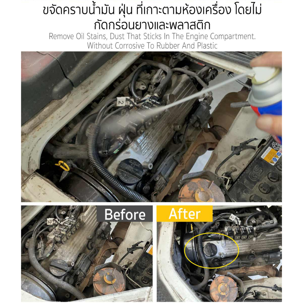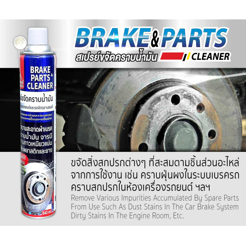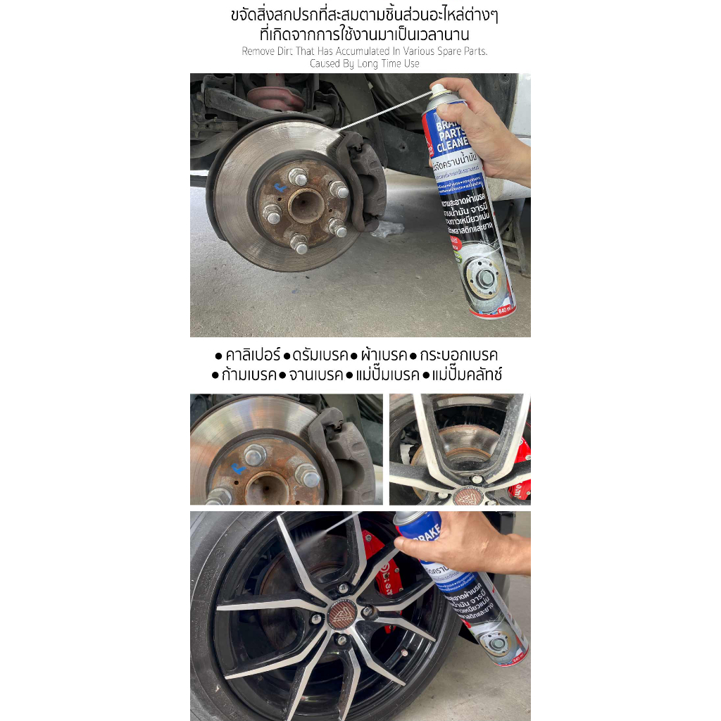 ... ังจากดิสก์เบรค ทำความสะอาด โซ่รถจักรยานยนต์ทุกประเภท (ทั้งบนถนนและทางวิบาก) และ โซ่ยนนต์อื่นๆ ทำความสะอาดหน้าห้องเครื่องยนต์ทุกประเภท ทำความสะอาดสิ่งสกปรกได้ดี โดยไม่ต้องทำการถอดอุปกรณ์ต่างๆออก แห้งไว ไม่ทิ้งคราบ ใช้งานง่าย สะดวก และรวดเร็ว ไม่กระทบต่อวัสดุประเภทยาง โลหะ และพลาสติก Feature Maintain brake system, Full efficiency and Zero noise. Clean all types of motorcycle chains. (Both on the road and off-road) and other chains. Clean the front of the engine room of all types. Powerful cleaning without removing brake parts. Quick dry, Leave no residue. Convenient and Quickly Can be used on rubber, Metal and Plastic. วิธีใช้ เขย่าก่อนใช้งาน ฉีดห่างจากเบรค และชิ้นส่วนของเบรค ประมาณ 30-40 ซม. ทิ้งไว้สักครู่ น้ำยาจะชะล้างคราบสกปรกให้ไหลออกมา โดยไม่ต้องล้างน้ำหรือเช็ดออก หากมีคราบน้ำมันเยอะหรือคราบฝังแน่นที่อุปกรณ์เบรค ให้ฉีดซ้ำ 2-3 ครั้ง ปล่อยให้แห้ง จากนั้นทดสอบการเบรคก่อนเริ่มการขับขี่อีกครั้ง How to use Shake before use. Spray away from brake and other parts at 30-40 cm. Leave for a while, The solution will wash away grease and stains, Without rinsing and Wiping off. In case of greasy oil or Ingrained stains, Repeat spray 2-3 Times. Let spray dry, and testing brake before beginning driving. คำแนะนำ เก็บสเปรย์ขจัดคราบน้ำมันให้ห่างจากเด็ก ควรสวมใส่ถุงมือ แว่นตา และหน้ากากป้องกัน ขณะใช้งาน เก็บในที่เย็น แห้ง อากาศถ่ายเทสะดวก Suggestion Keep away from children. Wear protective gloves, Glasses and Mask when working. Store in a cool, Dry, Well ventilated place. คำเตือน ละอองน้ำยา ทำให้เกิดการระคายเคืองที่ตาและผิวหนังได้ เป็นอันตรายหากสูดดมหรือกลืนกิน เก็บให้ห่างจากความร้อน ประกายไฟ ไม่ควรเก็บในที่อุณหภูมิสูงเกิน 50℃