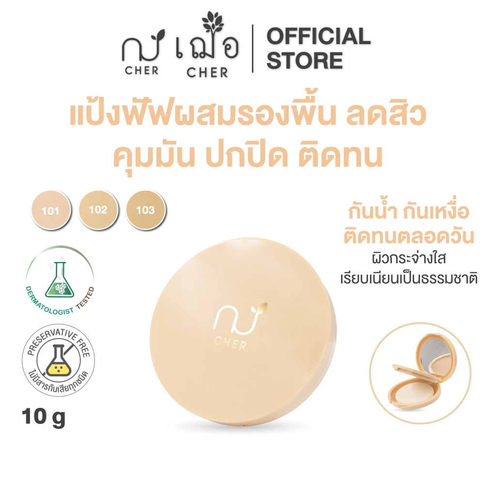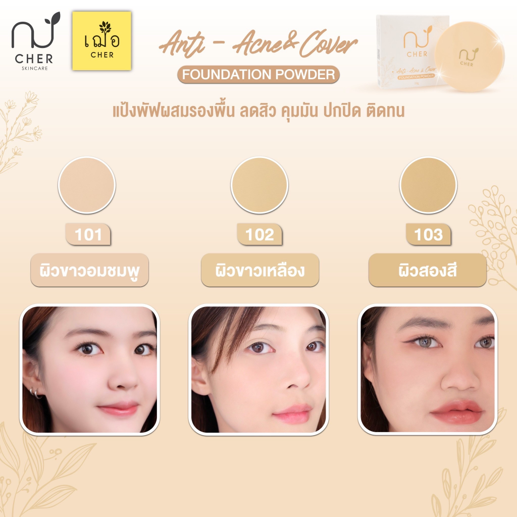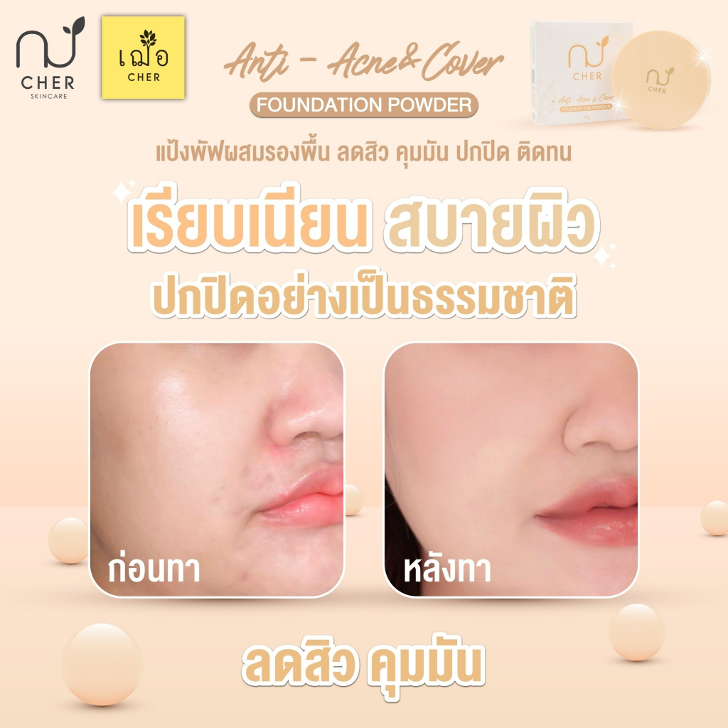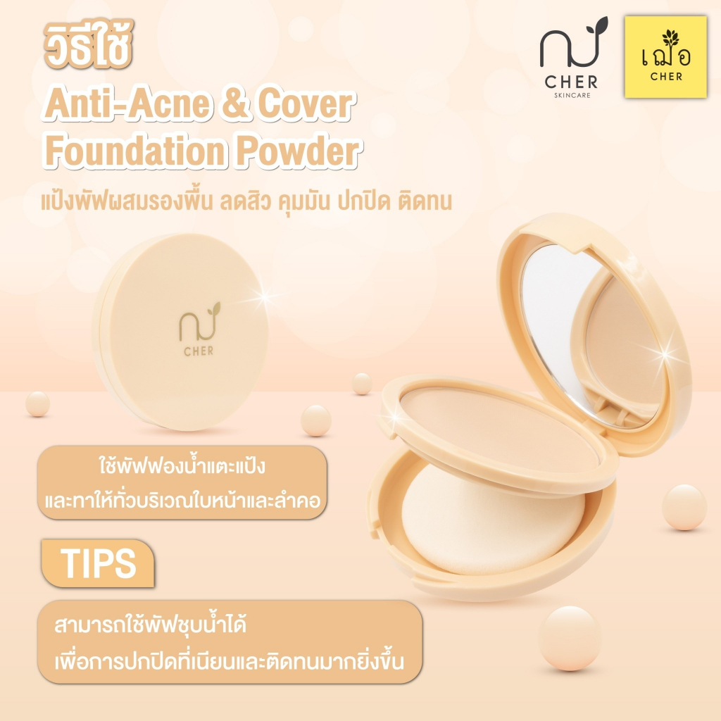 CHER Anti-Acne & Cover Foundation Powder เฌอ แป้งพัฟผสมรองพื้น ช่วยลดสิว ควบคุมความมัน ปกปิด ติดทน กันน้ำ กันเหงื่อ ไม่เป็นคราบ ปรับสีให้แลดูกระจ่างใส เรียบเนียนเข้ากับผิวอย่างเป็นธรรมชาติ สีแป้ง ไม่ดรอป ช่วยลดแบคทีเรีย ลดสิว ป้องกันผิวจากแสง UV และแสงสีฟ้า ✅ เหมาะสำหรับผิวแพ้ง่าย 👩🏻⚕️👨🏻
