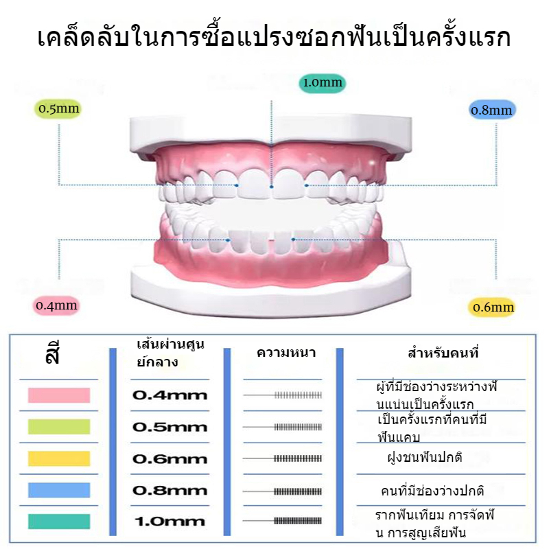 ... ้: 1. เลือกหัวแปรงที่มีขนาดที่เหมาะสม 2. สอดหัวแปรงเข้าไปบริเวณซอกเหล็กดัดฟัน หรือ ซอกฟัน 3. เลื่อนไปมาเพื่อทำความสะอาดระหว่างซอกฟันและขจัดสิ่งตกค้าง 4. หลังการใช้งานล้างและเช็ดให้แห้งด้วยน้ำสะอาด คำแนะนำ: 1. ในการใช้ผลิตภัณฑ์ไม่ควรออกแรงมากเกินไป นั้นอาจทำให้เกิดการระคายเคืองระหว่างเหงือก 2. เด็กควรใช้ภายใต้คำแนะนำของผู้ปกครองหรือทันตแพทย์ 3. หากมีเลือดออกผิดปกติระหว่างการใช้งานโปรดหยุดใช้ทันทีและปรึกษาทันตแพทย์ 4. กรุณาล้างและทำความสะอาดหัวแปรงหลังการใช้งานและเก็บไว้ในที่แห้งและเย็น