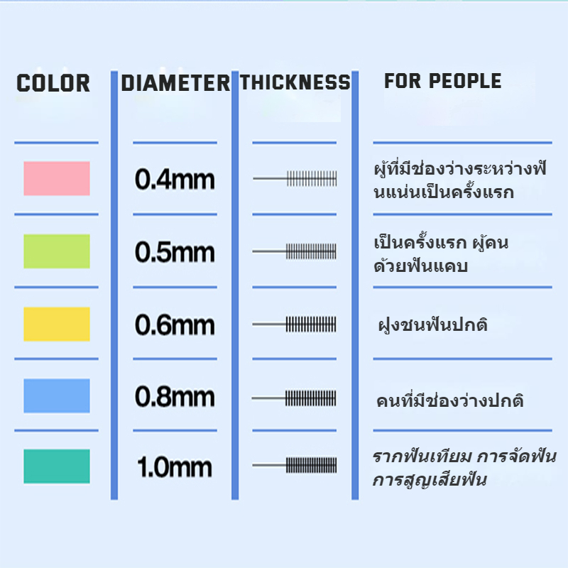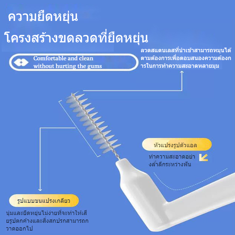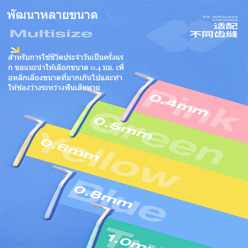 รายละเอียดสินค้า: การออกแบบหัวแปรงรูปตัว L เพื่อความสะดวกในการทำความสะอาดบริเวณซอกฟันที่มองไม่เห็น ขนแปรงดูปองท์ยืดหยุ่นและทนทานไม่เสียรูปง่าย ดูแลเหงือกที่บอบบาง ด้ามจับกันลื่นแบบยาวสะดวกสบายในการถือและมีฝาปิดเพื่อง่ายแก่การพกพา ขนาดของผลิตภัณฑ์: 0.4มม., 0.5มม., 0.6มม., 0.8มม., 1.0มม. วิธีใช