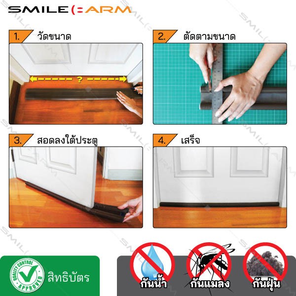 🏆 สิทธิบัตรการออกแบบ 39 ประเทศทั่วโลก (By Smilearm) 🏆 ใบรับรองผลิตภัณฑ์ 🏆 OTOP 5 ดาว (2553) & OTOP 3 ดาว (2552) 🏆 รางวัลนักประดิษฐ์พันล้าน (#อุดหมดงดรั่ว) - - - - - - - - - - 📢 ประตูบานเปิดทั่วไป - ช่องว่างใต้ประตูจะต้องห่างไม่เกิน 1 cm. ไม่ต้องติดกาว ไม่ต้องขันน็อต ในการติดตั้ง 🚩 วิธี
