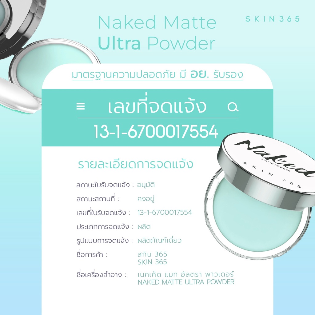 สกิน 365 แป้งเจลลี่เขียวลบมันพิมประภา แค่แทพเบาๆบนใบหน้าก็ลบมันได้ทันที พร้อมคุมมันยาวนาน SKIN365 Naked Matte Ultra Powder ✨️ 3 in 1 ลบมัน กันแดด หน้าใส ในตลับเดียว 🤦♀️ นวัตกรรมสินค้าใหม่ เนื้อเจลลี่ ไร้ฝุ่น ไร้สี เติมได้ทั้งวันไม่โป๊ะ ไม่ทิ้งคราบ ✨️ เทคโนโลยี Quik BlurTM ที่มีโมเลกุลทรงกล