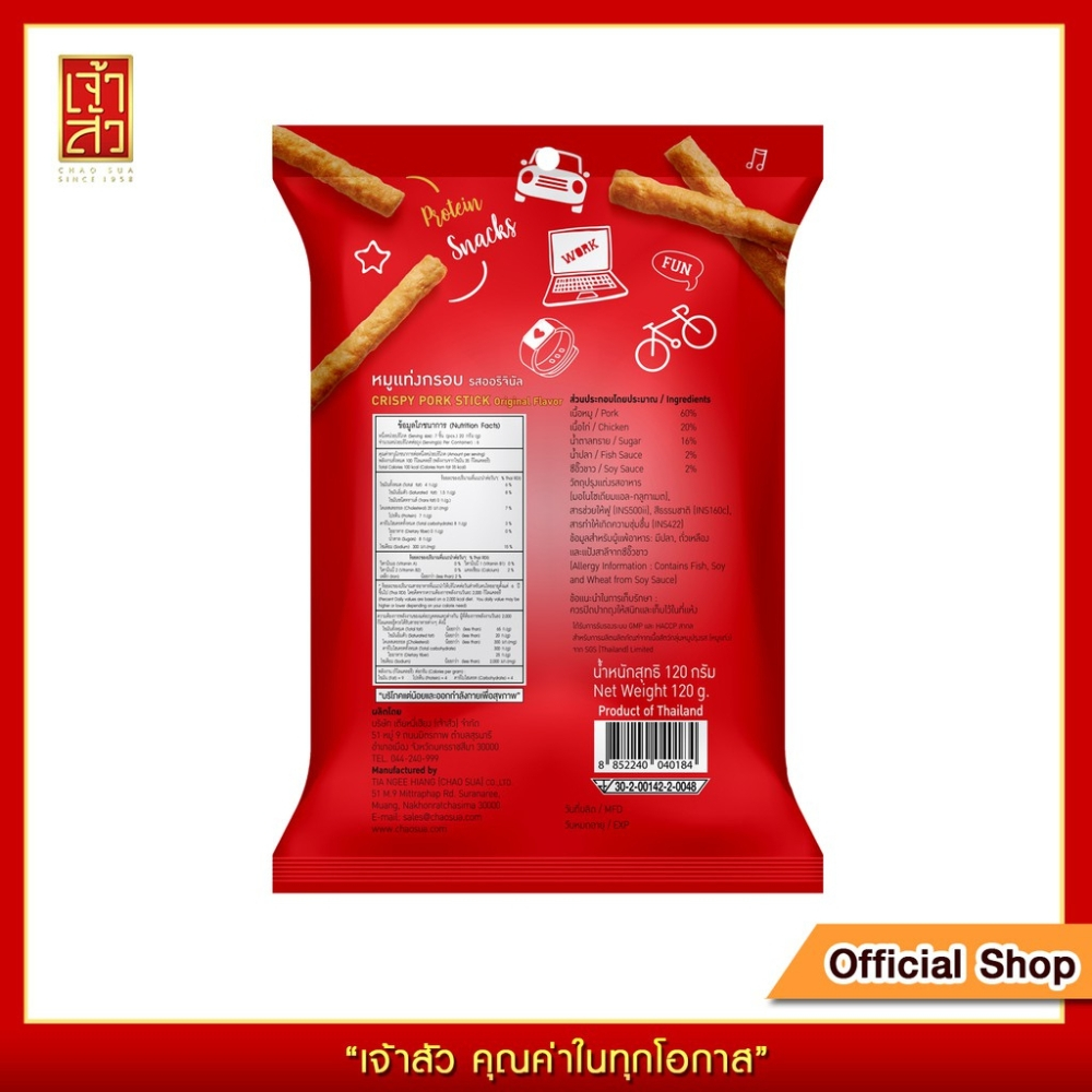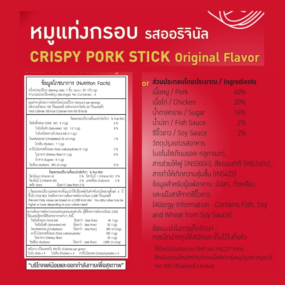 เจ้าสัว หมูแท่งกรอบ รสออริจินัล 110 กรัม ส่วนประกอบโดยประมาณ : - เนื้อหมู 60% - เนื้อไก่ 20% - น้ำตาลทราย 16% - น้ำปลา 2% - ซีอิ้วขาว 2% ได้รับการรับรองระบบ GMP สากล สำหรับการผลิตผลิตภัณฑ์จากเนื้อสัตว์ ข้อมูลสำหรับคนแพ้อาหาร : มีปลา , ถั่วเหลือง , แป้งสาลีจากซีอิ้วขาว วิธีการเก็บรักษ