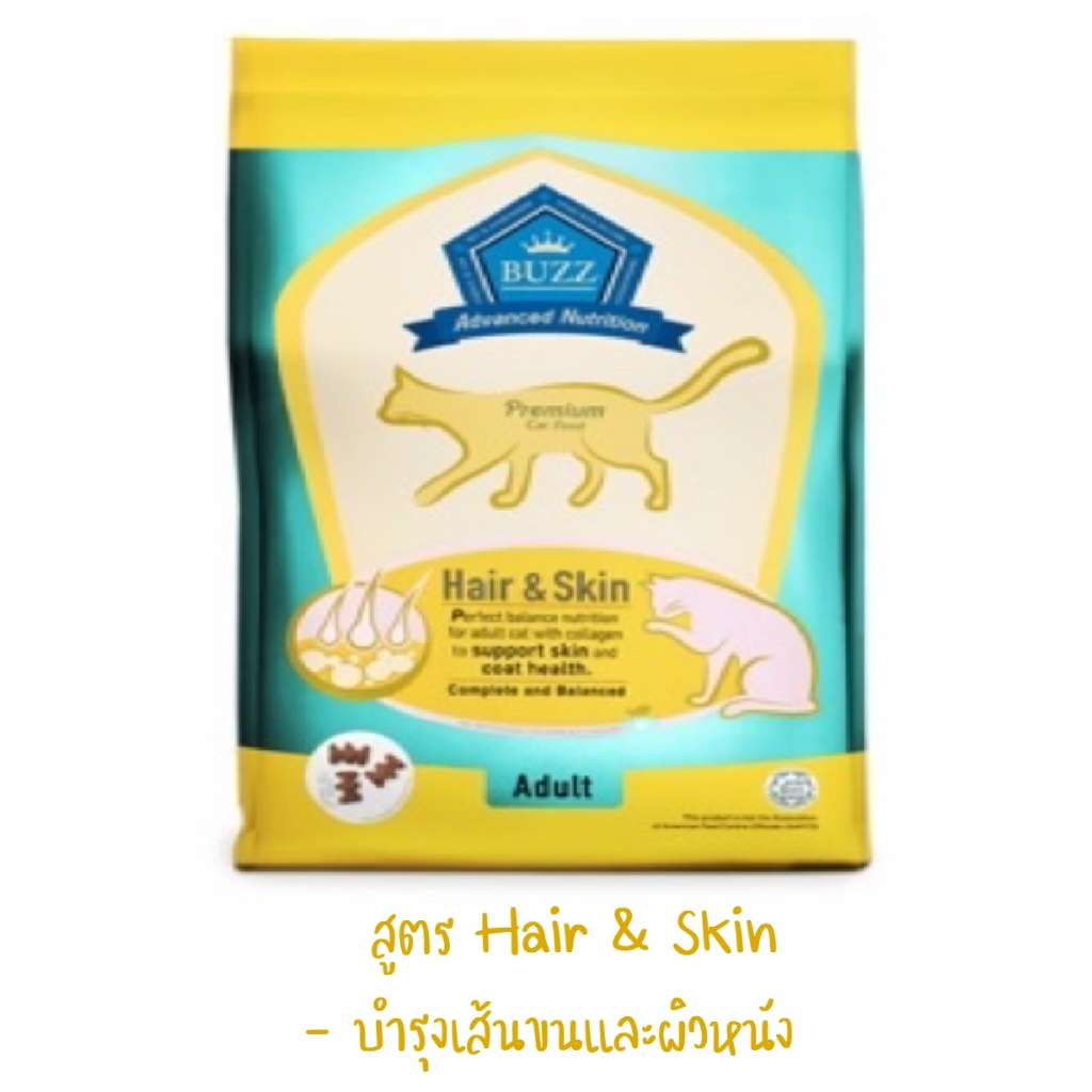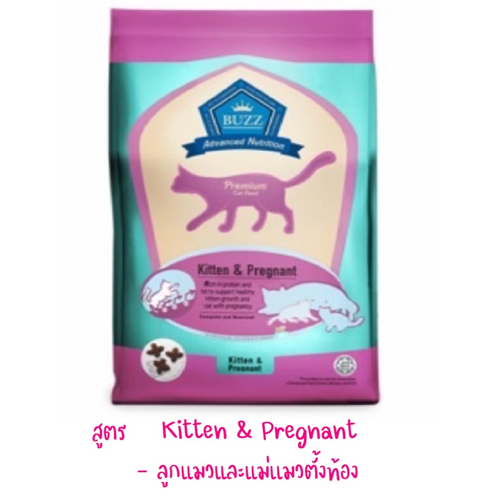 ... ้ำหนัก BUZZ Weight+ (เม็ดเป็นตัว Y สีน้ำตาล) สำหรับแมวโต 1 ปีขึ้นไป ทุกสายพันธุ์ โปรตีน สูงถึง 38% ไขมัน 16 % - เพื่อเพิ่มน้ำหนักและสุขภาพที่ดี ประกอบด้วยโปรตีนจากปลาทูน่าและแซลมอน ไฮโดรไลเสต ซึ่งเป็นแหล่งโปรตีนชั้นเลิศย่อยง่าย - มีเส้นใยเซลลูโลสพลัส เพื่อช่วยให้เส้นขนผ่านทางเดินอาหารได้ดีขึ้น ลดความเสี่ยงในการสะสมของเส้นขนในกระเพาะอาหาร - ควบคุมปริมาณโซเดียม โพแทสเซียม และ แมกนีเซียม เพื่อป้องกันการเกิดโรคไต โรคนิ่วในแมว - มี โอเมก้า 6 จากน้ำมันรำข้าว และ โอเมก้า 3 จากน้ำมันปลาแซลมอน ที่ช่วยบำรุงสุขภาพผิวหนังและขน - ช่วยพัฒนากล้ามเนื้อและกระดูกให้แข็งแรงรวมถึงช่วยดูแลระบบการเผาผลาญไขมันให้ดีขึ้น - ช่วยให้หัวใจแข็งแรงและส่งเสริมการทำงานของตับ - ไม่เเต่งสี ไม่ใส่สารกันบูด สูตร Kitten&Pregnant (สูตรแม่และลูกแมว) (เม็ดเป็นตัว X สีน้ำตาล เม็ดเล็ก) สำหรับลูกแมว และ แม่แมวตั้งครรภ์ โปรตีนสูงถึง 40% และ ไขมัน 20 % - มี โอเมก้า 6 จากน้ำมันรำข้าวและ โอเมก้า 3 จากน้ำมันปลาแซลมอนที่ช่วยบำรุงสุขภาพผิวหนังและขน - มีทอรีนบำรุงสายตา - มี วิตามิน E และ C เสริมสร้างภูมิต้านทาน - มี แอลคานิทีน ช่วยพัฒนากล้ามเนื้อและกระดูกให้แข็งแรง รวมถึงช่วยระบบการเผาผลาญไขมันให้ดีขึ้น - ช่วยให้หัวใจแข็งแรงและส่งเสริมการทำงานของตับ - ฟรุกโตโอลิโกแซ็กคาไรด์ ช่วยย่อยอาหารและส่งผลดีต่อสุขภาพ - ไม่เเต่งสี ไม่ใส่สารกันบูด สูตร Hair&Skin บำรุงขนและผิวหนัง (เม็ดหยักๆ คล้าย W สีน้ำตาล)+ โปรตีนสูงถึง 36% และ ไขมัน 14 % - สำหรับแมวโต 1 ปีขึ้นไป ทุกสายพันธุ์ - เพิ่มคอลลาเจนเพื่อสุขภาพผิวหนังและเส้นขน - ควบคุมปริมาณโซเดียม โพแทสเซียม และ แมกนีเซียม เพื่อป้องกันการเกิดโรคไต โรคนิ่วในแมว - มี โอเมก้า 6 จากน้ำมันรำข้าวและ โอเมก้า 3 จากน้ำมันปลาแซลมอนที่ช่วยบำรุงสุขภาพผิวหนังและขน - มี แอลคานิทีน ช่วยพัฒนากล้ามเนื้อและกระดูกให้แข็งแรงรวมถึงช่วยระบบการเผาผลาญไขมันให้ดีขึ้น - ช่วยให้หัวใจแข็งแรงและส่งเสริมการทำงานของตับ - ฟรุกโตโอลิโกแซ็กคาไรด์ ช่วยย่อยอาหารและส่งผลดีต่อสุขภาพ - ไม่เเต่งสี ไม่ใส่สารกันบูด สูตร Indoor แมวเลี้ยงในบ้าน (เม็ดเป็นตัวปลา เล็กๆ สีน้ำตาล) โปรตีนสูงถึง 34% และ ไขมัน 12 % สำหรับแมวโต 1 ปีขึ้นไป ทุกสายพันธุ์ - สารสกัดจากยัคคาชิดิเจอร่า ช่วยลดกลิ่นมูลเวลาขับถ่าย - มีเส้นใยเซลลูโลสพลัส เพื่อช่วยให้เส้นขนผ่านทางเดินอาหารได้ดีขึ้น ลดความเสี่ยงในการสะสมของเส้นขนในกระเพาะอาหาร - ควบคุมปริมาณโซเดียม โพแทสเซียม และ แมกนีเซียม เพื่อป้องกันการเกิดโรคไต โรคนิ่วในแมว - มี โอเมก้า 6 จากน้ำมันรำข้า