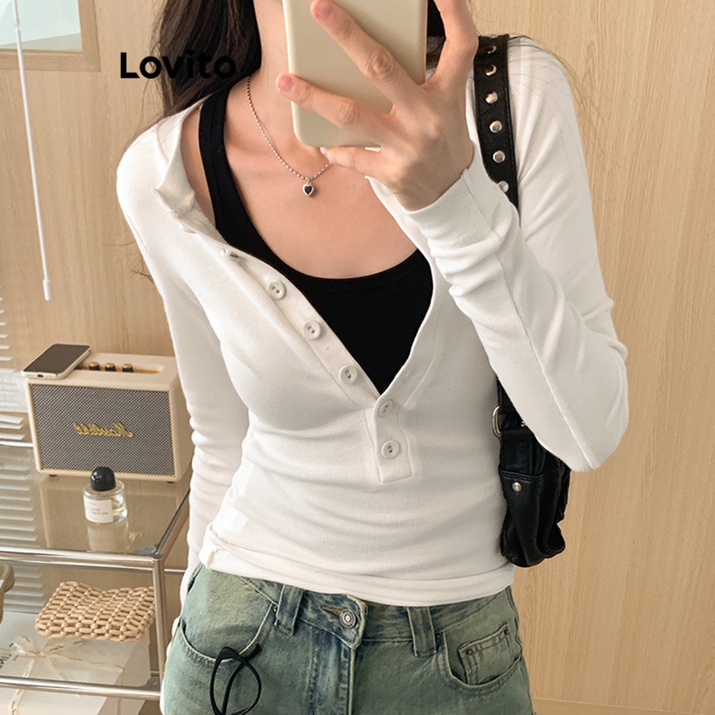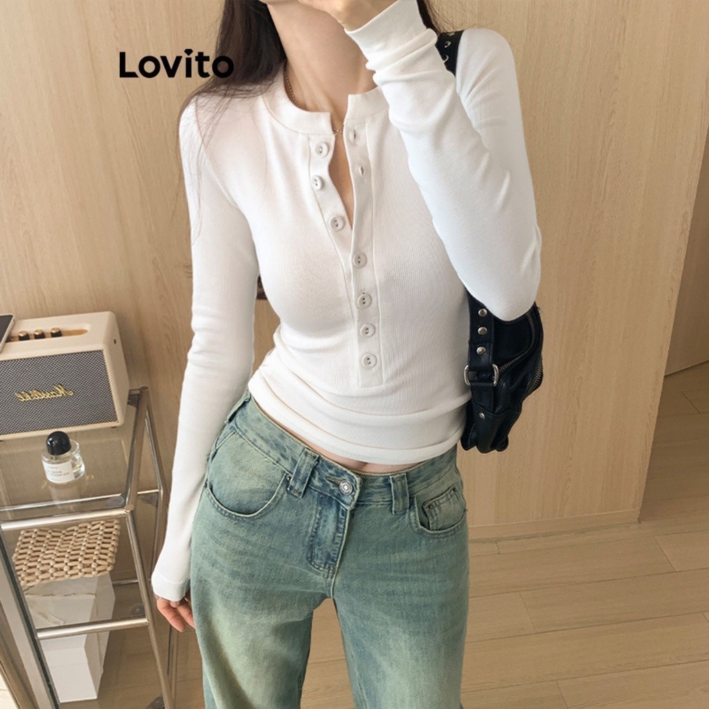 Lovito เสื้อยืดผู้หญิง แขนยาว เบสิก กระดุมด้านหน้า สีพื้น สไตล์ลำลอง LNE24138 (สีขาว)