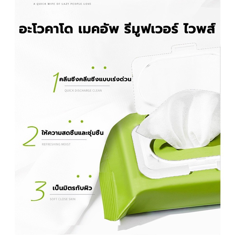 ทิชชู่เปียกเช็ดเครื่องสำอาง อะโวคาโด เมคอัพ รีมูฟเวอร์ 60 แผ่น​ แพ็คเกจแบบห่อพร้อมฝาปิดกันสิ่งสกปรก ขนาดพกพาสะดวกแผ่นเช็ดทำความสะอาดเครื่องสำอาง ทิชชู่เปียกเช็ดเครื่องสำอาง เนื้อสัมผัสนุ่มละมุน อ่อนโยนต่อผิว ขจัดความมัน คราบเครื่องสำอาง และสิ่งสกปรกใบหน้าได้อย่างล้ำลึก ไม่ทิ้งคราบตกค้างนวัตกรรม