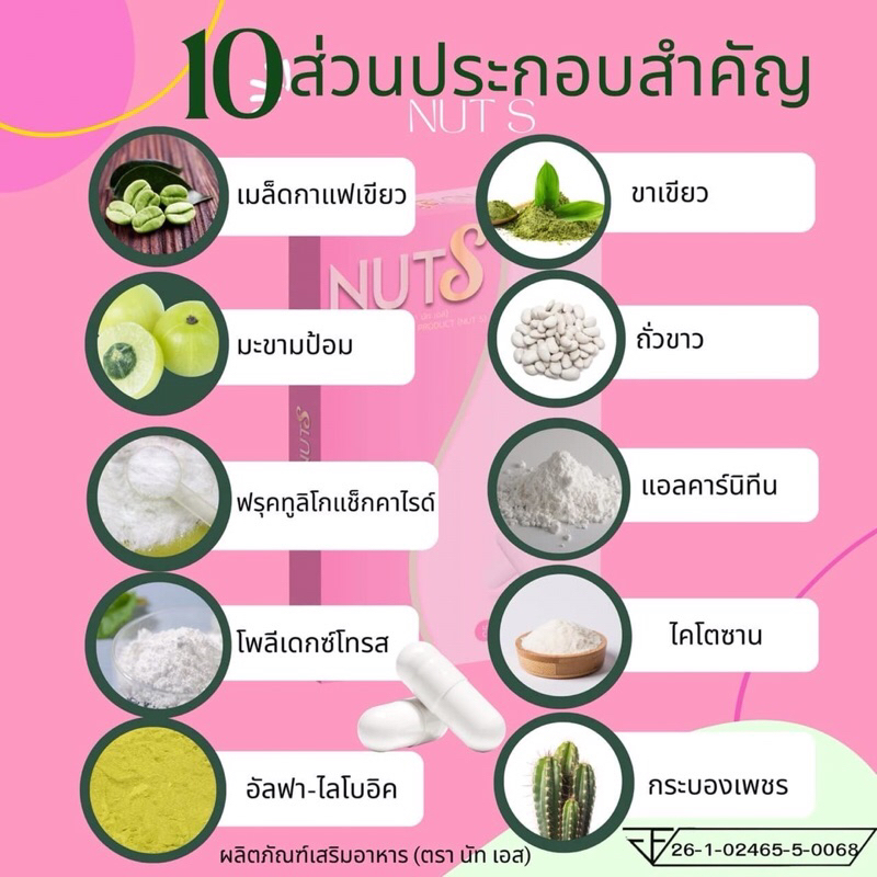 ผลิตภัณฑ์เสริมอาหารควบคุมน้ำหนักแคปขาว (Tester) 1 แผงมี 15 แคปซูล ทานก่อนอาหารมื้อแรก 30-40 นาที ผลิตภัณฑ์เสริมอาหารควบคุมน้ำหนักนัทเอส 1 กล่องมี 10 แคปซูล ทานก่อนอาหารมื้อแรก 30-40 นาที บุคคลห้ามทาน อายุต่ำกว่า 18 ปี , คุณแม่ให้นมบุตร ,บุคคลที่ตั้งครรภ์ มีโรคประจำตัวและทานยาหมอ