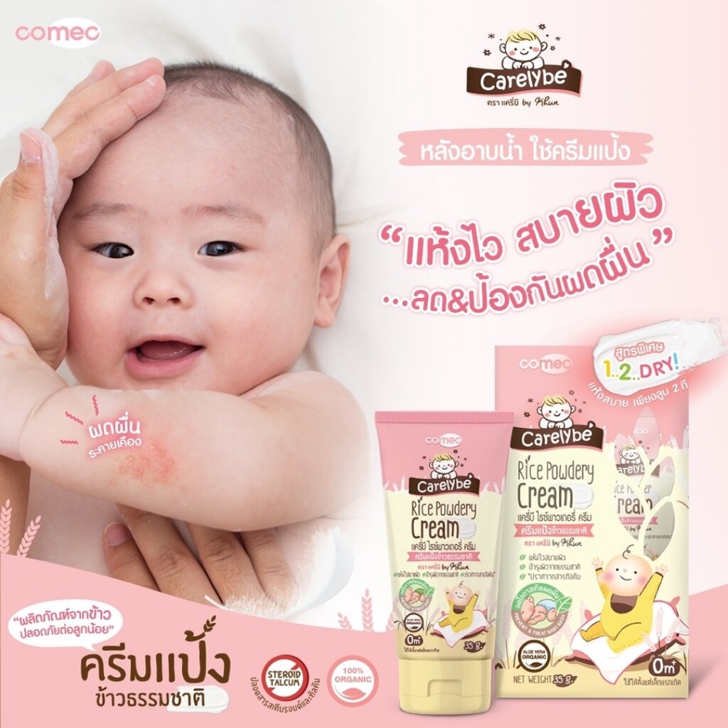 Carelybe แครี่บี ไรซ์พาวเดอรี่ ครีม (ขนาด 30 กรัม) ผลิตภัณฑ์ครีมแป้งข้าวธรรมชาติสบายผิวสำหรับเด็ก เพื่อลดและป้องกันผดผื่นทั้งยังช่วยเพิ่มความชุ่มชื้นให้กับผิวในตัว ด้วยส่วนประกอบสำคัญจากสารสกัดข้าวและน้ำมันรำข้าวที่อุดุมด้วยสารแอนตี้ออกซิแดนท์ ผสานด้วยออร์แกนิคอโลเวร่าที่มีแร่ธาตุ วิตามินและกรดอะมิ