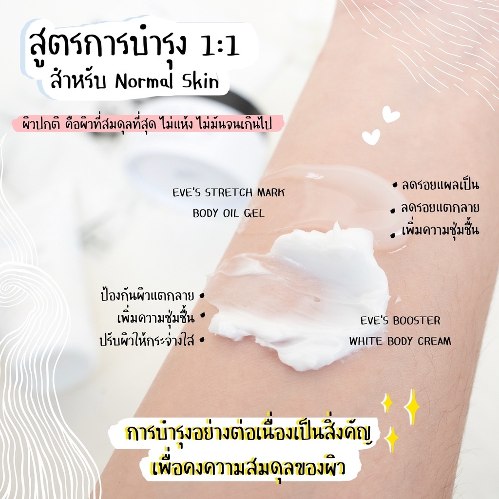 ... เหมาะกับทุกสภาพผิว ช่วยลดเลือนรอยแตกลาย บำรุงผิวเนียนนุ่ม คืนความชุ่มชื้น ลดรอยแผลเป็น จุดด่างดำ รอยคล้ำ ช่วยลดการสูญเสียน้ำในผิวหนัง สร้างเกราะป้องกันผิว ผิวแข็งแรง ช่วยชะลอความเสื่อมของเซลล์ผิว ผลิตภัณฑ์ในกล่อง • อีฟส์ สเทรช มาร์ค บอดี้ ออยล์ เจล ขนาด 90 g. • อีฟส์ บูสเตอร์ ไวท์ บอดี้ ครีม ขนาด 100 g. ========================================== อีฟส์ สเทรช มาร์ค บอดี้ ออยล์ เจล EVE'S STRETCH MARK BODY OIL GEL ผลิตภัณฑ์บํารุงผิว ที่อุดมไปด้วยสารสกัดจากไข่มุกบริสุทธิ์และ Black Mulberry ช่วยปกป้องผิวจากอนุมูลอิสระ ล็อคความชุ่มชื้นให้แก่ผิวได้ยาวนาน เหมาะสำหรับผิวที่ต้องการความชุ่มชื้นเป็นพิเศษ เกลี่ยง่าย ไม่เหนียวเหนอะหนะ ช่วยให้ผิวมีความยืดหยุ่น เหมาะกับทุกสภาพผิว • ช่วยลดเลือนรอยแตกลาย • บำรุงผิวเนียนนุ่ม คืนความชุ่มชื้นให้แก่ผิว • รอยแผลเป็น จุดด่างดำ รอยคล้ำ แลดูจางลง • ช่วยลดการสูญเสียน้ำในผิวหนัง • สร้างเกราะป้องกันผิว ผิวแข็งแรง • ช่วยชะลอความเสื่อมของเซลล์ผิว • สร้างเกราะป้องกันผิว ปกป้องผิวจากมลภาวะ • ปรับผิวให้เรียบเนียน ดูอิ่มน้ำยิ่งขึ้น • ช่วยต่อต้านอนุมูลอิสระ ช่วยปกป้องเซลล์ผิวอย่างล้ำลึก วิธีใช้ : ทาลงบนบริเวณผิวกาย หรือบริเวณผิวที่แห้งเป็นพิเศษ สามารถผสมกับครีมบูสเตอร์หรือโลชั่นได้ปริมาณตามความชอบ โดยผสมที่ฝ่ามือก่อนชโลมลงบนผิว ผลิตโดย : บริษัท เนจ ไซเอนซ์ จำกัด ที่ตั้ง : เลขที่ 5/10 หมู่ 10 ตำบล บางแม่นาง อำเภอ บางใหญ่ จังหวัด นนทบุรี 11140 จัดจำหน่ายโดย : บริษัท อีฟส์ สโตร์ จำกัด (VIP32) วัน เดือน ปี ที่ผลิต : ดุที่บรรจุภัณฑ์ เลขที่จดแจ้ง : 12-1-6500002441 ปริมาณสุทธิ : 90 g. ========================================== อีฟส์ บูสเตอร์ ไวท์ บอดี้ ครีม EVE'S BOOSTER WHITE BODY CREAM #ครีมทาท้องลายหลังคลอด อีฟส์ บูสเตอร์ ไวท์ บอดี้ ครีม ครีมแก้ก้นดำ รอยยุงกัด ขาลาย ขาหนีบดำ รักแร้ดำ ตอบโจทย์ทุกปัญหาผิวกาย ปรับผิวขาวกระจ่างใสอย่างเป็นธรรมชาติ เพิ่มความชุ่มชื้น ยืดหยุ่นแก่ผิว ช่วยสมานผิวให้เรียบเนียน ลดเลือนจุดด่างดำ รอยยุงกัด รอยแผลเป็น เพิ่มความแข็งแรง และปกป้องผิวจากมลภาวะ ชะลอการเสื่อมสภาพของเซลล์ผิว • บั้นท้ายหมองคล้ำให้ เรียบ เนียน ขึ้น • รอยแตกลายค่อยๆจางลง • สิวลดลงและป้องกันการเกิดซ้ำ • ขาหนีบหมองคล้ำดูจางลง ขาว เนียน • รักแร้ดำจะกลับมาขาวกระจ่างใจ เรียบ เนียน • คอ เข่า ข้อศอกดำกลับมาขาวกระจ่างใส ผลิตโดย : บริษัท เนจ ไซเอนซ์ จำกัด ที่ตั้ง :เลขที่ 5/10 หมู่ 10 ตำบล บางแม่นาง อำเภอ บางใหญ่ จังหวัด นนทบุรี 11140 จัดจำหน่ายโดย : บริษัท อีฟส์ สโตร์ จำกัด (VIP32) วัน เดือน ปี ที่ผลิต : ดุที่บรรจุภัณฑ์ เลขที่จดแจ้ง : 12-1-6200036864 ปริมาณสุทธิ : 100 g. ===========