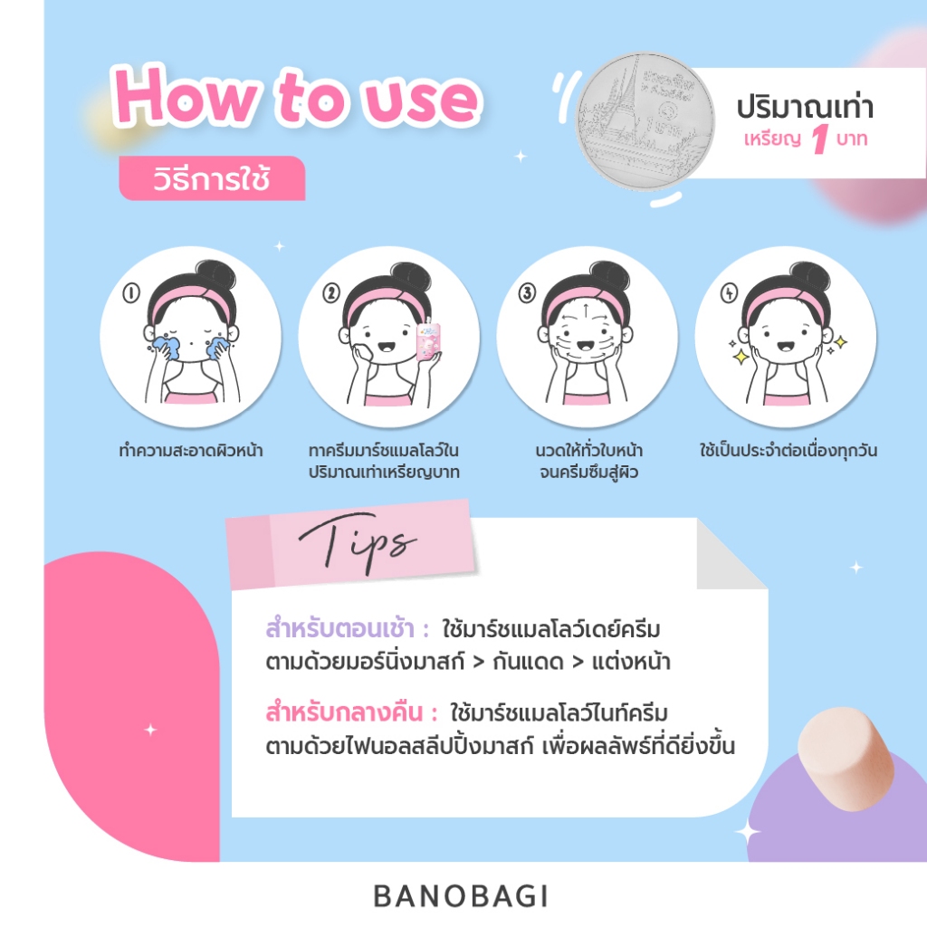 มาร์ชแมล์โลว์ไนท์ครีม สูตรสำหรับผิวหมองคล้ำ และผิวเสียสะสมจากแสงแดด ด้วย เอ็มบลิก้า ที่มีวิตามินซีเข้มข้นสูงกว่าวิตามินซีทั่วไป สารสกัดไวท์เทนนิ่งบูสอัพ 3 ชนิด อาร์บูติน เจจูแครอท และยูซุ เข้าฟื้นบำรุงผิวคล้ำเสีย ฝ้าแดด จุดด่างดำสะสมให้ดูจางลง เผยผิวโกลว์ใสมีออร่า วิธีใช้ : ใช้ทาบำรุงผิวทั่วใบห