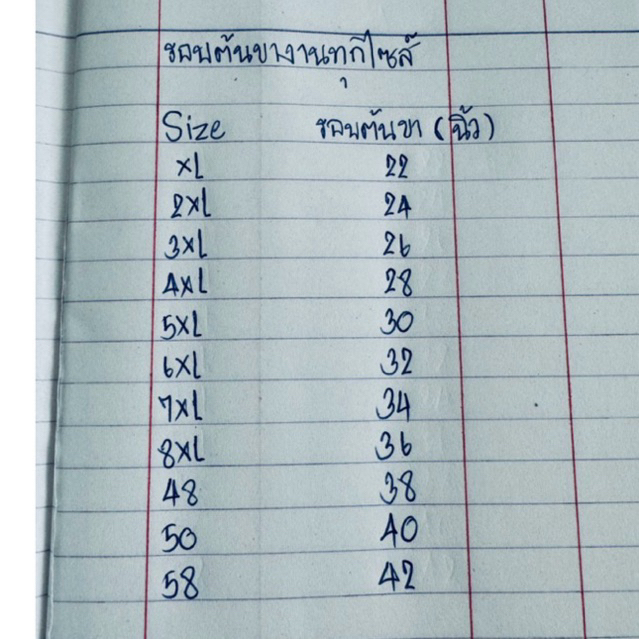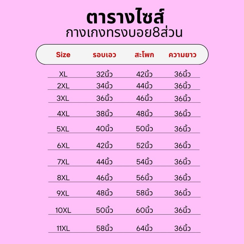 ... ้วจะเลยตาตุ่มขึ้นมาขาจะลอยขึ้นมาเกือบครึ่งแข้งหน่อยเป็นทรง8ส่วน(เพราะกางเกงทรง8ส่วนขาจะลอยอยู่แล้วค่ะ) เนื้อผ้าบาบี้ ผ้านุ่ม ลื่น ไม่ยับง่าย สินค้ามีพร้อมส่งค่ะ มี10ไซส์ให้เลือกเลย มี4สี ตารางไซส์ XLเอว32 ส.พ42 2 XLเอว34 ส.พ44 3 XLเอว36 ส.พ46 4 XLเอว38 ส.พ48 5 XLเอว40 ส.พ50 6 XLเอว42 ส.พ52 7 XLเอว44 ส.พ54 8 XLเอว46 ส.พ56 9 XLเอว48 ส.พ58 10 XLเอว50 ส.พ60 14 XLเอว58 ส.พ64 #ความยาว36นิ้วทุกไซส์ค่ะ เพื่อประโยชน์ของลูกค้า **ลูกค้าไม่ต้องเผื่อไซส์หรือลดไซส์ของตัวเองเพราะแพทเทิ้นทำมาตรงไซส์พอดี และ รบกวนลูกค้าอ่านตารางไซส์ให้ชัดเจนก่อนสั่งด้วยนะคะ**