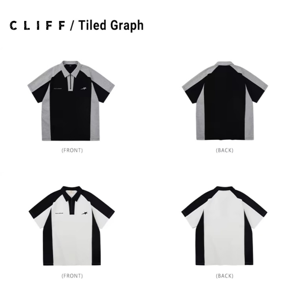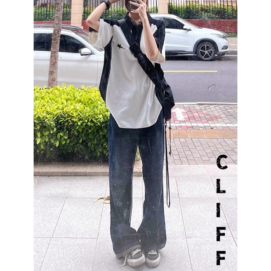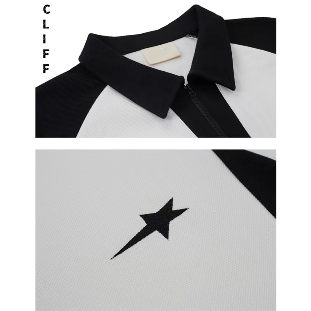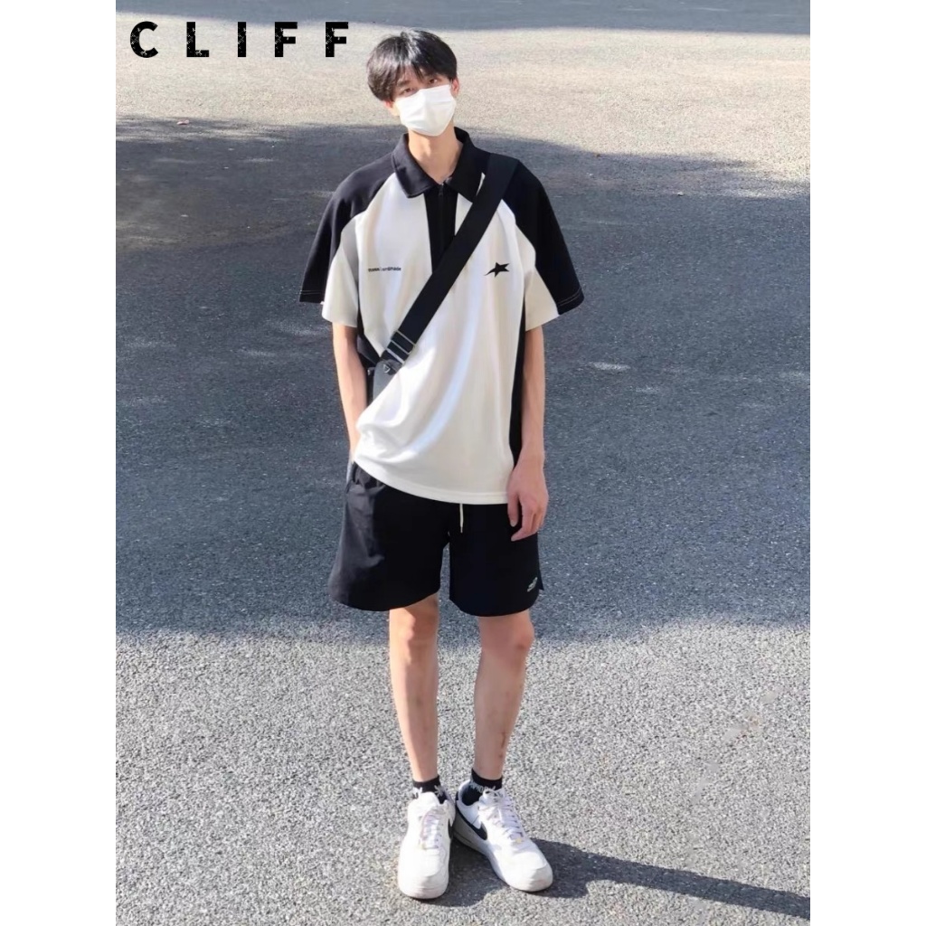 CLIFF เสื้อเชิ้ตผู้ชาย สไตล์อเมริกันวินเทจ แขนสั้นเย็บสีตัดกัน เสื้อโปโล ชุดลำลองสำหรับนักเรียน ชุดคู่รัก