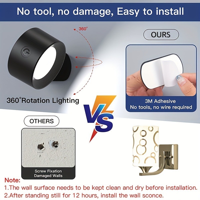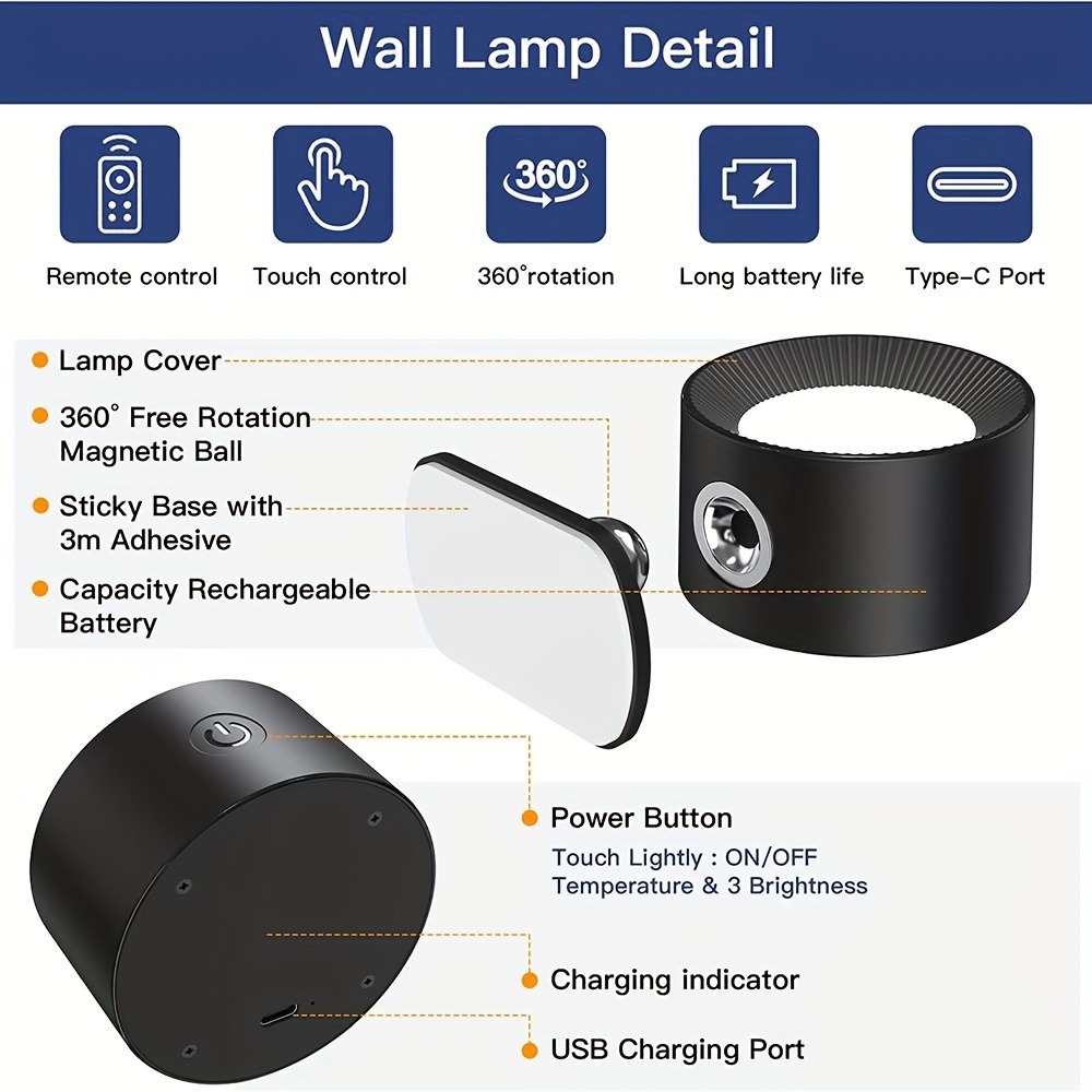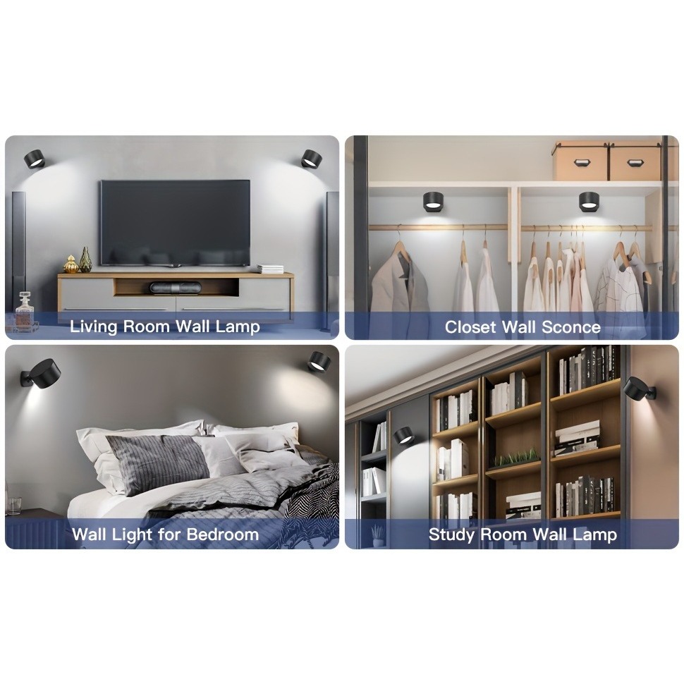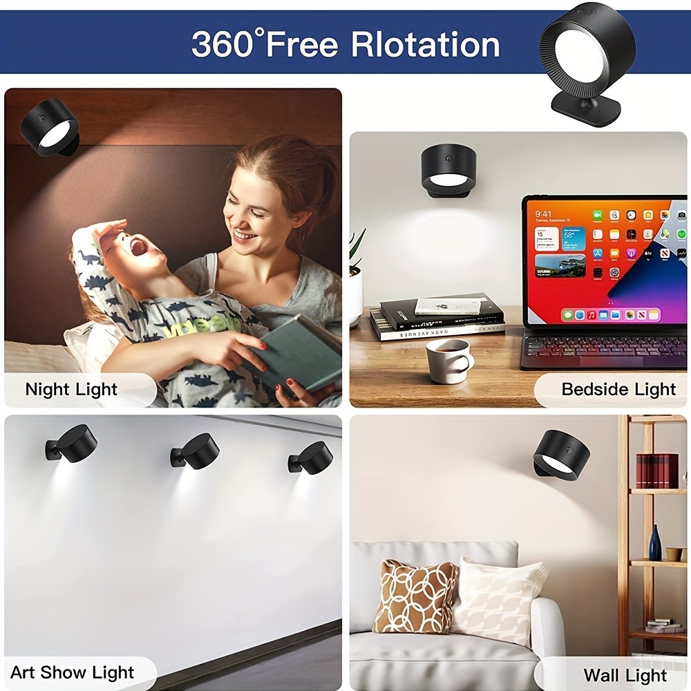 โคมไฟติดผนัง LED ไร้สาย แบบชาร์จไฟได้ - 360° โคมไฟอ่านหนังสือ หมุนได้ หรี่แสงได้ ชาร์จ USB พร้อมรีโมต สไตล์โมเดิร์น สําหรับอ่านหนังสือ