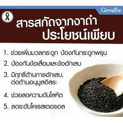 ... ่ เซซามิน(Sesamin) เซซาโมลิน(Sesamolin) และเซซามินิล กลูโคไซด์(Sesaminol glucosides) ทั้งหมดนี้ มีคุณสมบัติหลายประการ – ช่วยเพิ่มมวลกระดูก ป้องกันกระดูกพรุน – ป้องกันข้อเสื่อมและข้ออักเสบ – มีฤทธิ์ต่อต้านอนุมูลอิสระ และต้านการอักเสบ – ช่วยปกป้อง และบำรุงตับ รวมถึงการลดการสร้างโคเลสเตอรอลที่ตับ – ช่วยลดความดันโลหิต – ช่วยลดระดับโคเลสเตอรอล และลดการเกิดตะกอนในผนังเส้นเลือด – ลดความเสี่ยงโรคหัวใจ – ช่วยยับยั้งทำลายเซลล์มะเร็งเต้านม, มะเร็งตับ, มะเร็งเม็ดเลือดขาวบางชนิด เหมาะสำหรับ : บุคคลทั่วไปเพื่อบำรุงร่างกาย, บำรุงสมอง, ป้องกันมะเร็งได้หลายชนิด **** ไม่มีข้อห้ามในทุกๆ โรค **** มีงานวิจัยที่ทำในผู้ป่วยความดันโลหิตสูง โดยให้รับประทานสารสกัดเซซามินจากงาดำ 60 มก. ต่อวัน เป็นระยะเวลา 4 สัปดาห์ พบว่า สามารถลดความดันโลหิตได้เล็กน้อยประมาณ 2-3 มม.ปรอท จากระบาดวิทยาคลินิค แม้จะลดความดันโลหิตได้เล็กน้อยก็ถือว่ามีประโยชน์ต่อการช่วยลดความเสี่ยงของโรคทางสมองและหัวใจ ผลิตภัณฑ์เสริมอาหารสารสกัดจากงาดำ ผสมข้าวกล้องหอมนิลงอก วิตามินซี และซีลีเนียม ชนิดแคปซูล (ตรา กิฟฟารีน) ส่วนประกอบที่สำคัญโดยประมาณใน 1 แคปซูล o สารสกัดจากงาดำ 33.333% (200มก.) o ข้าวกล้องหอมนิลงอกบด 27.5% (165มก.) o งาดำบด 8.333 % (50มก.) o แคลเซียม แอสคอร์เบต %97 3.119 % (18.715 มก.) (ให้วิตามินซี 15 มก.) o ซีลีเนียม อะมิโนแอซิดคีเลต 1%0.292% (1.75มก.) (ให้ซีลีเนียม 17.5 มคก.) วิธีใช้ : วันละ1-2 แคปซูล หลังอาหาร รหัสสินค้า 41029 ปริมาณสุทธิ : 60.00 แคปซูล น้ำหนักรวม : 65 กรัม #งาดำ #เซซามิน #อาหารเสริม #กิฟฟารีน #giffarine #ช่วยเพิ่มมวลกระดูก #ช่วยปกป้องและบำรุงตับ #ลดความดันโลหิต #มะเร็งเต้านม #มะเร็งตับ #มะเร็งเม็ดเลือดบางชนิด #ทานได้ทั้งชายและหญิง #ไม่มีข้อห้ามทุกโรค #กระดูก #กระดูกพรุน #กระดูกแข็งแรง #ลดความดันโลหิต #มวลกระดูก #อาหารเสริมงาดำ