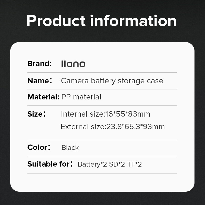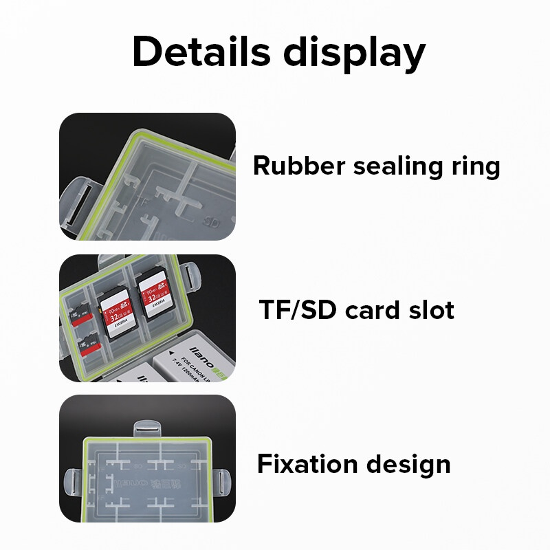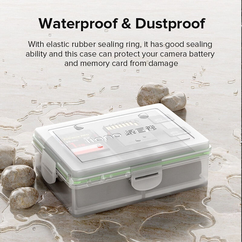 ป้องกันฝุ่นละอองและน้ำกระเซ็น แบตเตอรี่ / ที่เก็บการ์ดหน่วยความจำ: กล้องถ่ายรูป / ที่เก็บการ์ดหน่วยความจำ 1.【ใช้วัสดุที่มีความหนา PP และไม่มีการเสียรูปและทนทานต่อการใช้งานในระยะยาว 2.【ฟองน้ำ EVA ในตัวใช้ที่ด้านล่างเพื่อป้องกันการกระแทกและปกป้องแบตเตอรี่ของคุณได้ดีขึ้น 3.【ด้วยแหวนปิดผนึกยาง