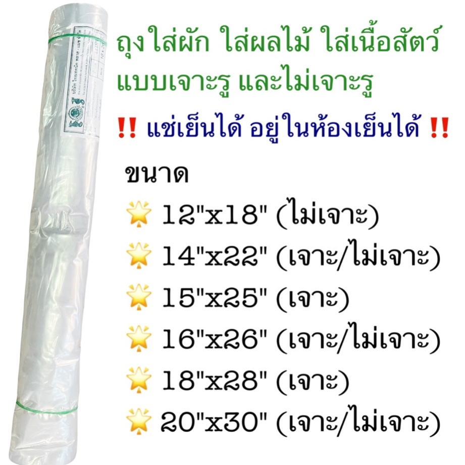 ... ันเป็นก้อน 🌟ความยืดหยุ่นสูง ทนต่อการฉีกขาด รับน้ำหนักได้มาก 🌟ทนต่อความเย็นได้ดี สามารถทนต่อความเย็นได้ในอุณหภูมิติดลบ เหมาะกับการเก็บรักษาของไว้ในช่องฟรีซหรือการแช่แข็ง ถุงไม่เจาะ : เหมาะกับการใส่อาหารเพื่อแช่แข็ง ในปริมาณมาก น้ำหนักเยอะ เหมาะกับการใส่ของที่ไม่มีความจำเป็นให้อากาศไหลเวียนผ่านตลอดเวลา ตัวอย่างการใช้งาน ถุงLLDPE ไม่เจาะ 12"x18" ไม่เจาะ ถุงใส่เห็ด 14"x22" ไม่เจาะ ถุงใส่ปลา ใส่อาหารแช่แข็ง หนัก5กิโล 16"x26" ไม่เจาะ ถุงใส่ปลา ใส่อาหารแช่แข็ง หนัก10กิโล 20"x30" ไม่เจาะ ถุงใส่ปลาแห้ง หนัก10กิโล ถุงเจาะ : เหมาะกับการใส่ผัก หรือของที่ต้องการให้อากาศไหลเวียนตลอด เพื่อป้องกันไม่ให้เกิดไอน้ำและความชื้นขังอยู่ในถุง มีส่วนช่วยป้องกันการเน่าเสีย ตัวอย่างการใช้งานถุงLLDPE เจาะ 14"x22" เจาะ ถุงใส่ของ หนัก5กิโล 16"x26" เจาะ ถุงใส่ผัก แตงกวา แตงโม หนัก10กิโล 18"x28" เจาะ ถุงใส่ใบผัก 20"x30" เจาะ ถุงใส่ผักบุ้ง ขนาด 12"x18" (มจ) 14"x22" (จ/มจ) 15"x25" (จ) 16"x26" (จ/มจ) 18"x28" (จ) 20"x30" (จ/มจ)