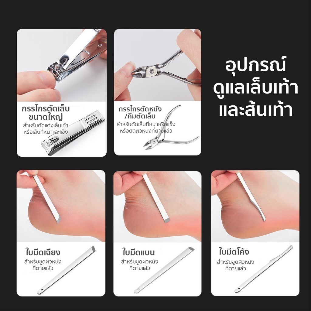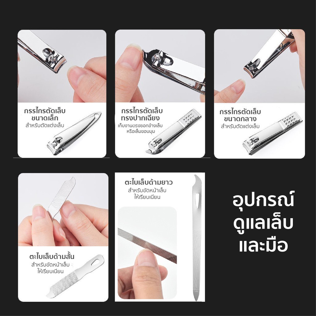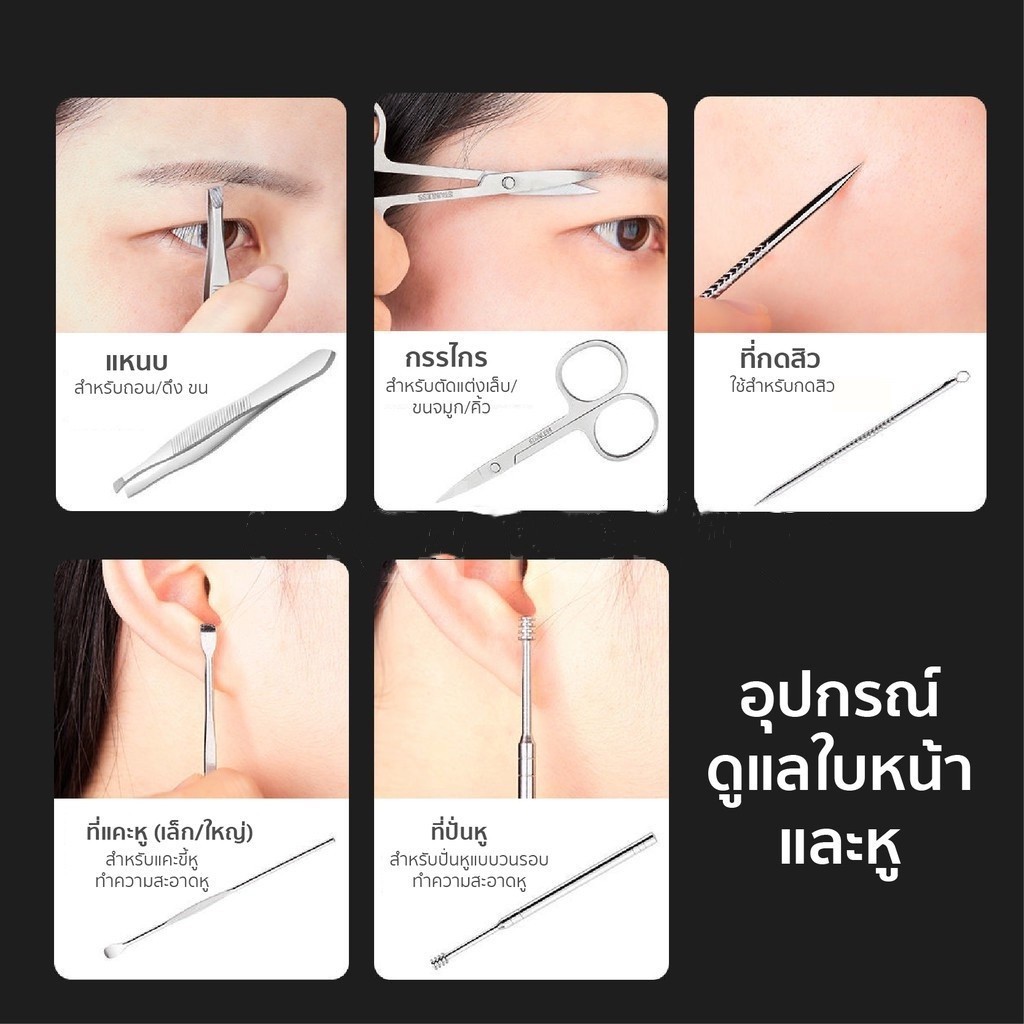 ... าดเล็ก : ใช้ตัดเล็บนิ้วมือ (มีแบบปากแหลมกับปากแบน) 1 * กรรไกรตัดเล็บขนาดใหญ่ : ใช้ตัดเล็บเท้าที่มีความแข็งและหนา 1 * กรรไกรตัดหนัง : ใช้ตัดหนังกำพร้าบริเวณขอบเล็บ 1 * ตะไบเล็บ : ใช้ลบความคมของเล็บหลังตัด ช่วยให้โค้งมนและเรียบ 1 * เครื่องเจียรหนัง : ใช้ตกแต่งผิวหนังที่ตายแล้วบริเวณขอบเล็บ 1 * แหนบ : ใช้ถอนขนคิ้วและขนคุด 1 * กรรไกรตัดขนคิ้ว : ตัดแต่งขนคิ้วให้สั้นลง 1 * มีดโกนขนาดเล็ก : ใช้กันขนคิ้วให้เป็นทรง 1 * กรรไกรตัดขนจมูก : ใช้เล็มขนจมูก 1 * มีดทำความสะอาดเล็บ : ทำความสะอาดสิ่งสกปรกในซอกเล็บ 1 * มีดขูดเล็บ : ใช้ขูดสีเจลหรืองัดเล็บปลอมออก 2 * ที่แคะหู : มีแบบหัวกลมกับปากแบนใช้ทำความสะอาดรูหู 1 * เครื่องมือรักษาสิว :ใช้กำจัดสิวหัวสิว 3 * ที่ขูดหนัง : ใช้ขูดหนังบริเวณเท้า (ใบมีดปากตรง ใบเฉียง และใบโค้ง) 👉 ขนาดสินค้าพกพาสะดวก กระเป๋ากว้าง 10 x ยาว 15 เซนติเมตร 👉 ข้อแนะนำ: เก็บไว้ในที่ร่ม ไม่เก็บในที่อับชื้น หรือร้อนเกินไป เพราะความร้อนจะทำให้หนังเสื่อมสภาพได้