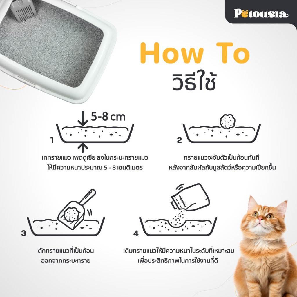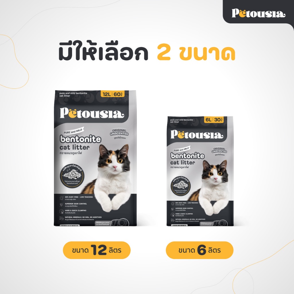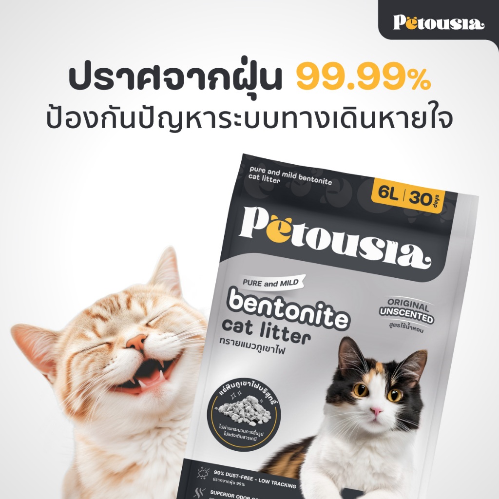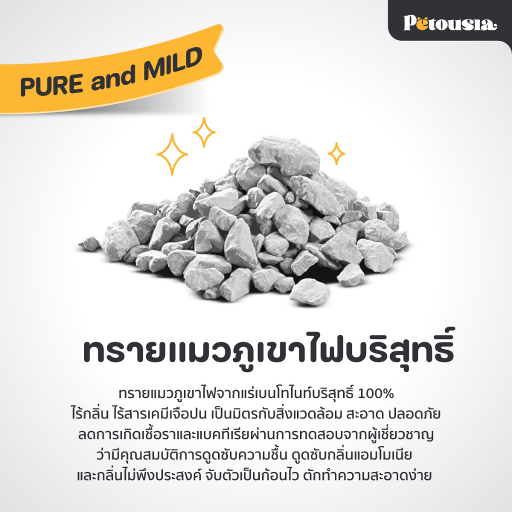 Petousia ทรายภูเขาไฟ ทรายแมวภูเขาไฟ เพตตูเซีย ทรายแมวภูเขาไฟจากแร่เบนโทไนท์บริสุทธิ์ 100% ไร้กลิ่น ไร้สารเคมีเจือปน เป็นมิตรกับสิ่งแวดล้อม สะอาด ปลอดภัย ลดการเกิดเชื้อราและแบคทีเรีย ผ่านการทดสอบจากผู้เชี่ยวชาญว่ามีคุณสมบัติการดูดซับความชื้น ดูดซับกลิ่นแอมโมเนีย และกลิ่นไม่พึงประสงค์ จับตัวเป็นก้อนไ