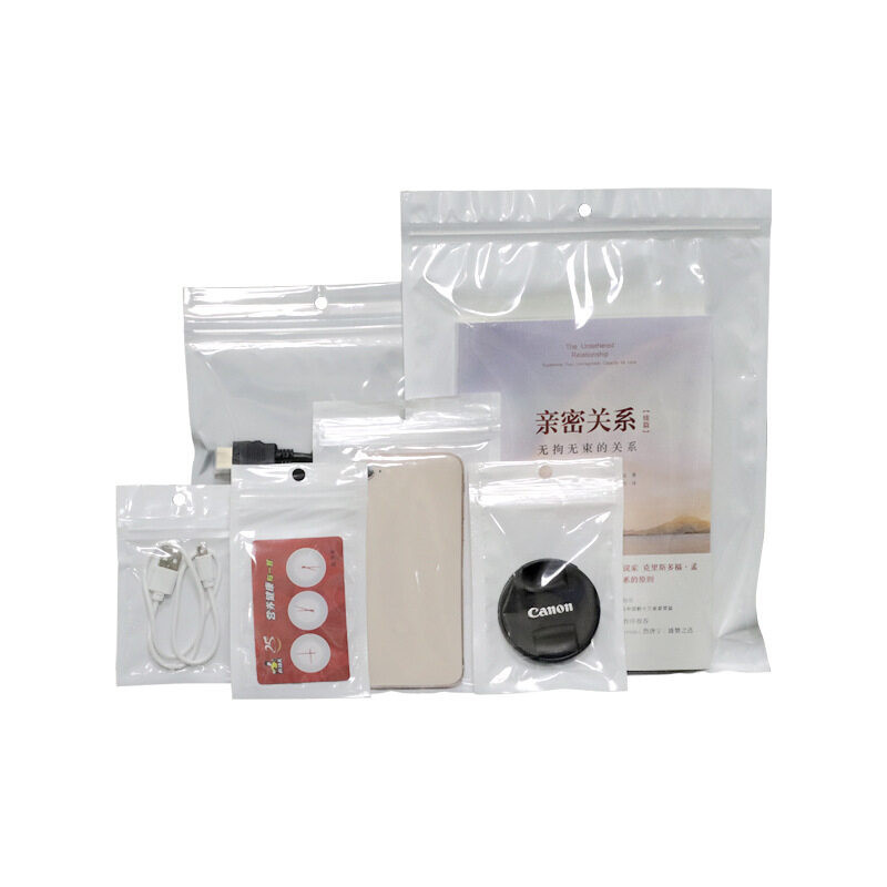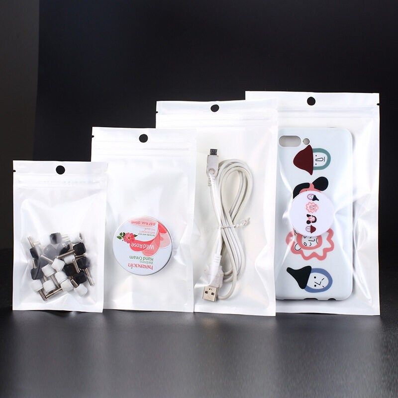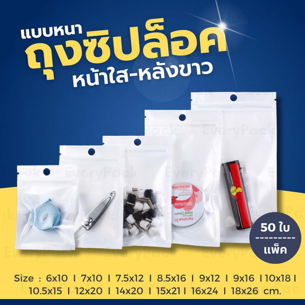 [แพ็ค 50 ใบ] ถุงขนม ถุงซิป ถุงซิปล็อค หน้าใส หลังขาว มีรูแขวน มีหลายขนาด สีขาว [PB11]