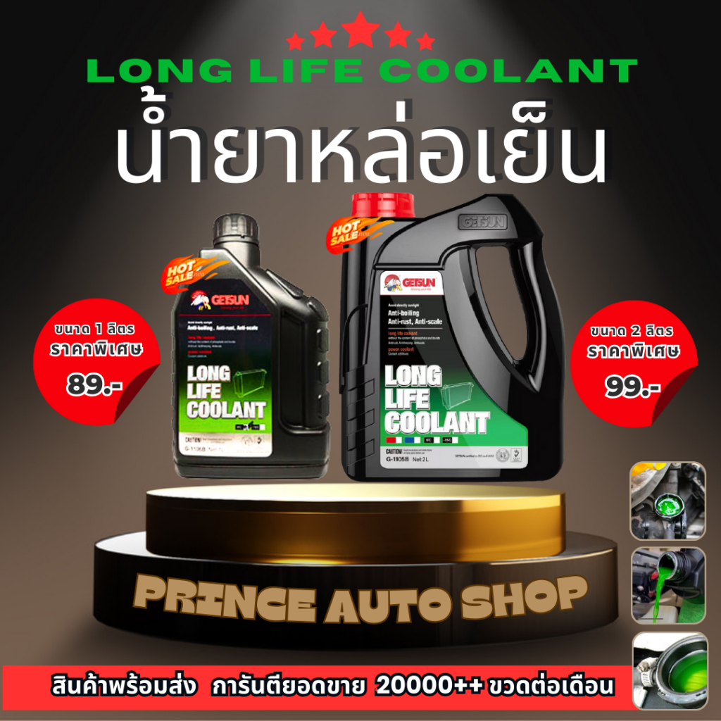 ... nt: ● ป้องกันการกัดกร่อนและความร้อน ● ปกป้องเครื่องยนต์ให้ยืดอายุการใช้งาน ● เหมาะสำหรับระบบหล่อเย็นทุกรุ่น คุณสมบัติเด่น: ● ให้การปกป้องระบบหล่อเย็นได้เป็นอย่างดี ● ช่วยให้อุณหภูมิน้ำในหม้อน้ำคงที่และป้องกันการ overheat ● สามารถป้องกันการกัดกร่อนในหม้อน้ำด้วยอนุภาคน้ำระดับนาโน ● อายุการใช้งานประมาณ 2 ปี และช่วยเพิ่มจุดเดือดของน้ำในหม้อน้ำ ● ช่วยเพิ่มการระบายความร้อนของหม้อน้ำ ● ลดการสะสมความร้อนในเสื้อสูบและฝาสูบของเครื่องยนต์ การใช้งาน: ● ใช้เมื่อต้องการเติมใหม่ทั้งระบบหรือในถังพัก ● ควรเปลี่ยนถ่ายน้ำยาเติมหม้อน้ำตามระยะเวลาเปลี่ยนถ่ายที่กำหนดในคู่มือรถยนต์ คำเตือน: ● ห้ามดื่มหรือรับประทาน ● เก็บให้พ้นจากมือเด็ก ● ไม่ควรสัมผัสน้ำยาโดยตรง ควรใส่ถุงมือขณะใช้งาน "GETSUN 1106B/1105B Super Long Life Coolant: น้ำยาหล่อเย็นที่ยืดอายุการใช้งานและป้องกันการกัดกร่อนอย่างเต็มประสิทธิภาพ! "
