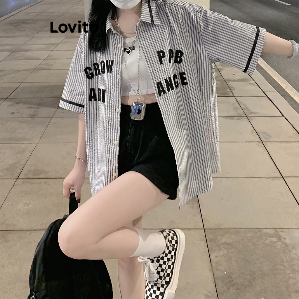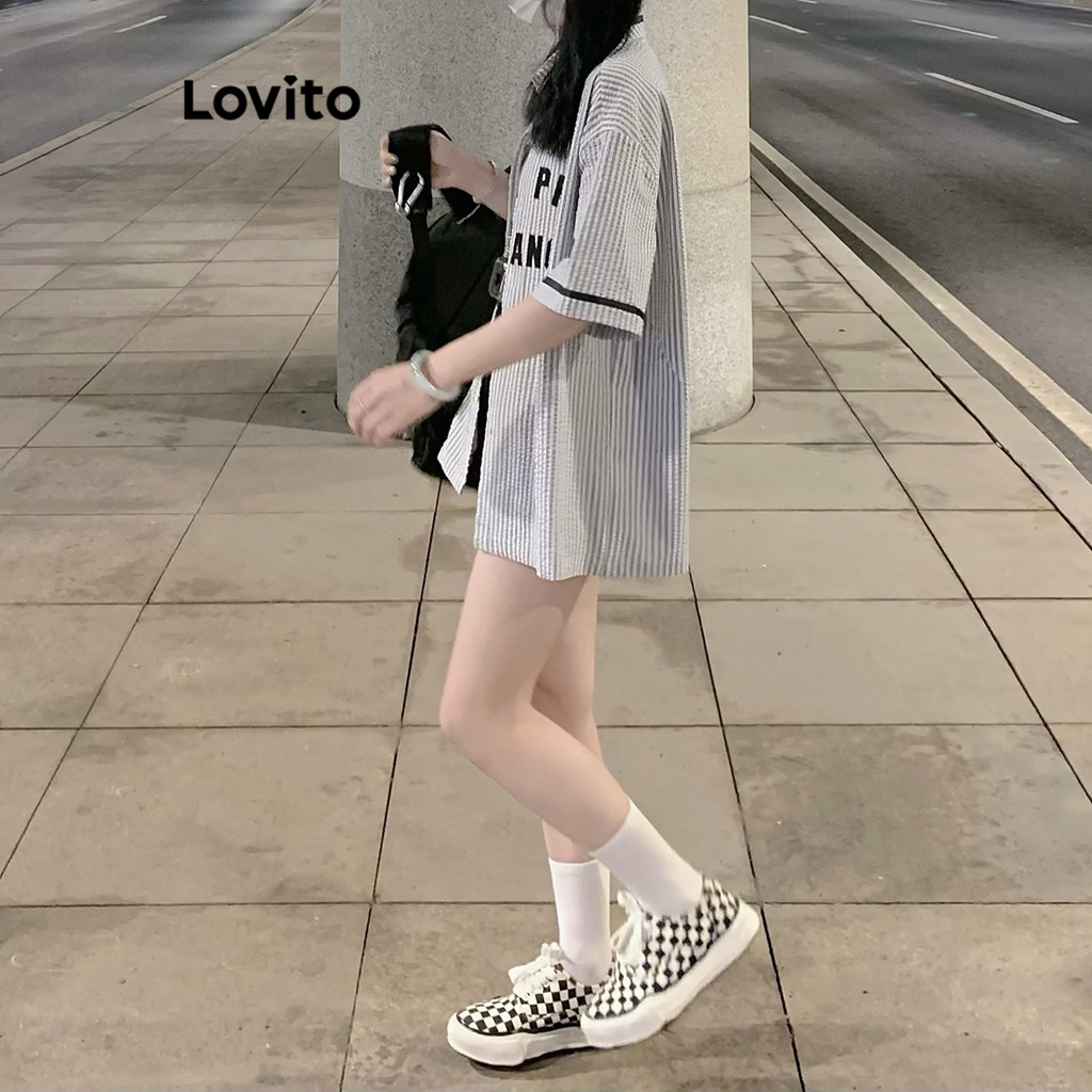 Lovito เสื้อเบลาส์ผู้หญิง ทรงหลวม ลายทาง แฟชั่นอเมริกันย้อนยุค ลายทาง สไตล์ลำลอง LNA50032