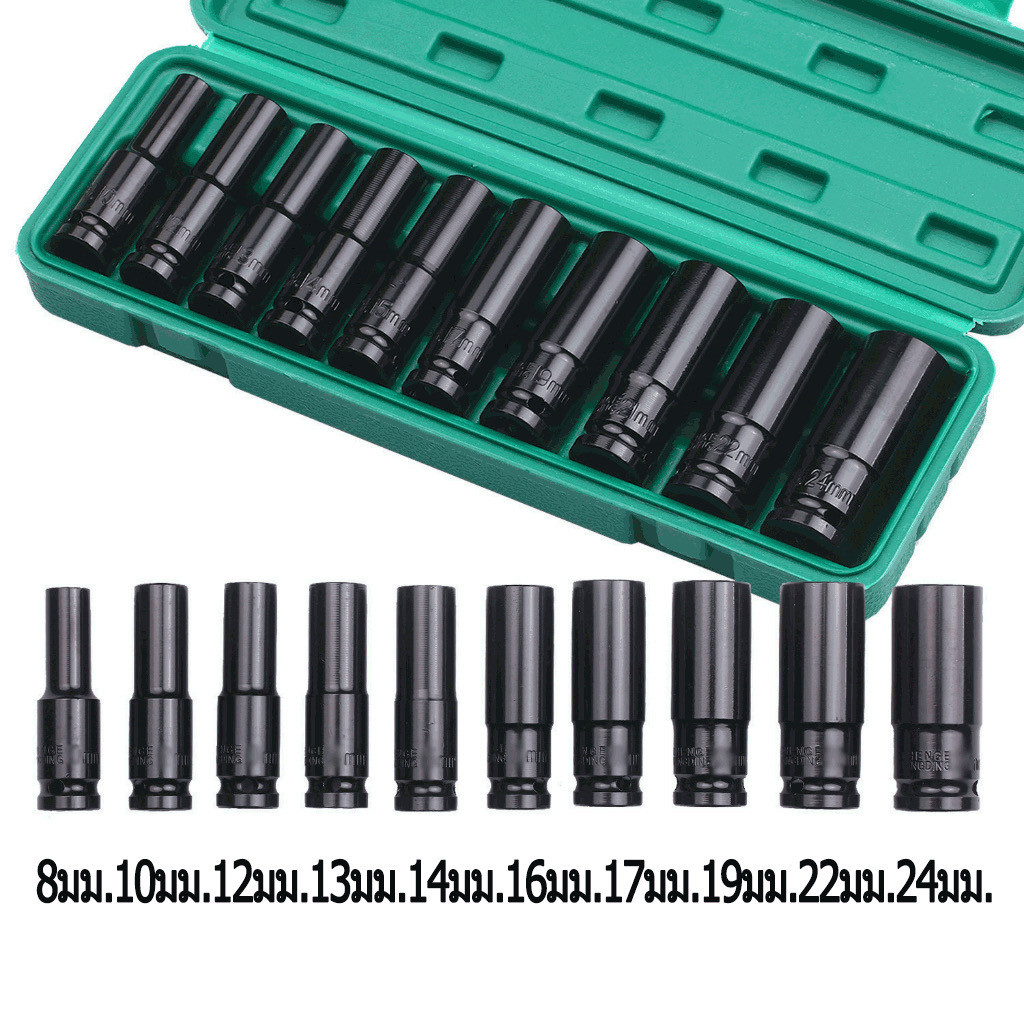 ชุดบล็อก บล็อกลม 4หุน 1/2" 10ชิ้น เบอร์ 8 10 12 13 14 16 17 19 22 24 mm ลูกบล็อกลมแบบยาว(ยาว78mm) เป็นงานรมดำอย่างดี รุ่นแข็งพิเศษ สำหรับบล็อกลมโดยเฉพาะ สามารถใช้งานหนัก งานอู่ได้เลย รองรับแรงบิดแรงกระแทกสูง ชุดบล็อก บล็อกลม 4หุน 1/2" 10ชิ้น เบอร์ 8 10 12 13 14 16 17 19 22 24 mm ลูกบล็อกลมแบ