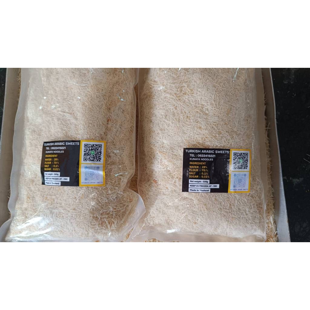 Kunafa Noodles white color & orange color Freshly made in thailand by Turkish Chef 100% wiht out preservatives 100% Halal เส้นสำหรับทำขนมคูนาฟ่าสีขาวและสีส้ม ทำสดใหม่ทุกวันโดยเชฟตุรกี ไม่ใส่สารกันบูด ฮาลาลทานได้ ลูกค้า กทม ต้องการสินค้าภายในวันถัดไป เลือกส่งด่วนได้ค่ะ หรือ ทักแชทได้