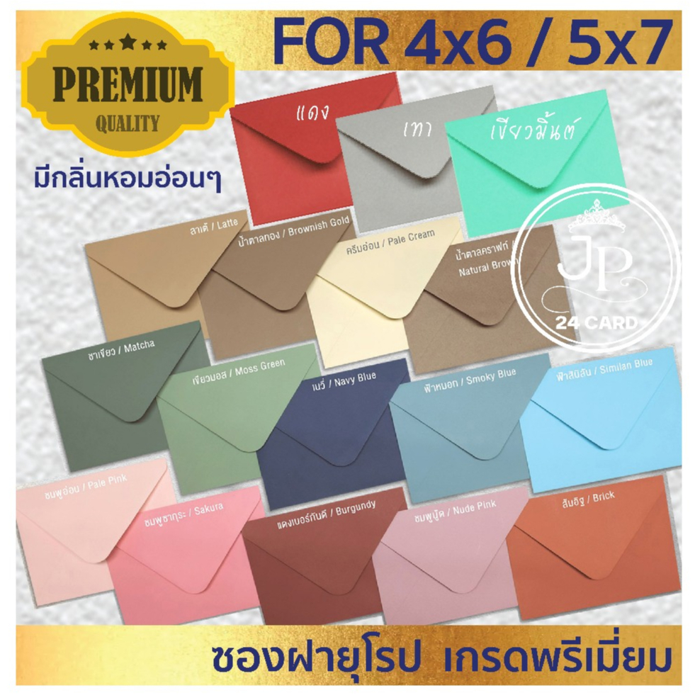 ... .................................... รายละเอียด :ซองเนื้อเมทาลิก สำหรับใส่การ์ด 5x7 นิ้ว ขนาด : 5.25 x 7.25 นิ้ว (สำหรับใส่การ์ด 5x7 นิ้ว) กระดาษเนื้อเมทาลิก ประกายมุก ความหนา : 100 แกรม บรรจุ : 1 แพ็ค มี 50 ซอง สีซองด้านนอกตามรูปภาพของซอง ด้านในซองสีขาว .......................................... รายละเอียด :ซองเนื้อเมทาลิก สำหรับใส่การ์ด 4x6 นิ้ว ขนาด : 4.25 x 6.25 นิ้ว (สำหรับใส่การ์ด 4x6 นิ้ว) กระดาษเนื้อเมทาลิก ประกายมุก ความหนา : 100 แกรม บรรจุ : 1 แพ็ค มี 50 ซอง สีซองด้านนอกตามรูปภาพของซอง ด้านในซองสีขาว ............................................. รายละเอียด :ซองปอนด์ สำหรับใส่การ์ด 5x7 นิ้ว ขนาด : 5.25 x 7.25 นิ้ว (สำหรับใส่การ์ด 5x7 นิ้ว) กระดาษปอนด์ ความหนา : 100 แกรม บรรจุ: 1 แพ็ค มี 50 ซอง สีซองด้านนอกและด้านในเป็นสีเดียวกัน ....................................... รายละเอียด : ซองปอนด์ สำหรับใส่การ์ด 4x6 นิ้ว ขนาด : 4.25 x 6.25 นิ้ว (สำหรับใส่การ์ด 4x6 นิ้ว) กระดาษปอนด์ ความหนา : 100 แกรม บรรจุ: 1 แพ็ค มี 50 ซอง สีซองด้านนอกและด้านในเป็นสีเดียวกัน ......................................... * มีชุดตัวอย่างซองจำหน่าย * (ชุดตัวอย่างซองเมทาลิก สำหรับใส่การ์ด 5x7 นิ้ว มี 6 สี (สีละ 1 ซอง) (ชุดตัวอย่างซองปอนด์ สำหรับใส่การ์ด 5x7 นิ้ว มี 18 สี (สีละ 1 ซอง) (ชุดตัวอย่างซองปอนด์ สำหรับใส่การ์ด 4x6 นิ้ว มี 13 สี (สีละ 1 ซอง) ......................................... ***คลิปวีดีโอหน้าคำสั่งซื้อ เป็นคลิปวีดีโอที่ทางร้านถ่ายเองทั้งหมด*** (ห้ามคัดลอก ดัดแปลง หรือก็อปปี้ วีดีโอหน้าคำสั่งซื้อของร้านไปใช้ หากพบเห็นจะดำเนินคดีตามกฎหมายถึงที่สุด) **สีที่ลูกค้าเห็นในจอ กับสีจริงที่มองจากดวงตา อาจต่างกันเล็กน้อย** ขึ้นอยู่กับการแสดงผลของหน้าจอ (มือถือ แทปเล็ต จอคอม) ที่แตกต่างกันค่ะ ......................................... ✔️ลูกค้าช่วยตรวจสอบ ชื่อ ที่อยู่ และเบอร์โทร สำหรับจัดส่งพัสดุ ที่แจ้งไว้ในระบบช็อปปี้ ให้ถูกต้องด้วยนะคะ✔️ 💢ได้รับสินค้าแล้วโปรดกดยืนยันการรับสินค้าให้ทางร้านด้วยนะคะ ขอบพระคุณลูกค้าค่ะ🙏🏻