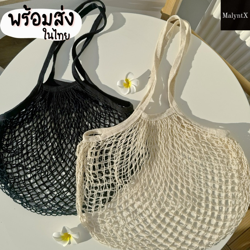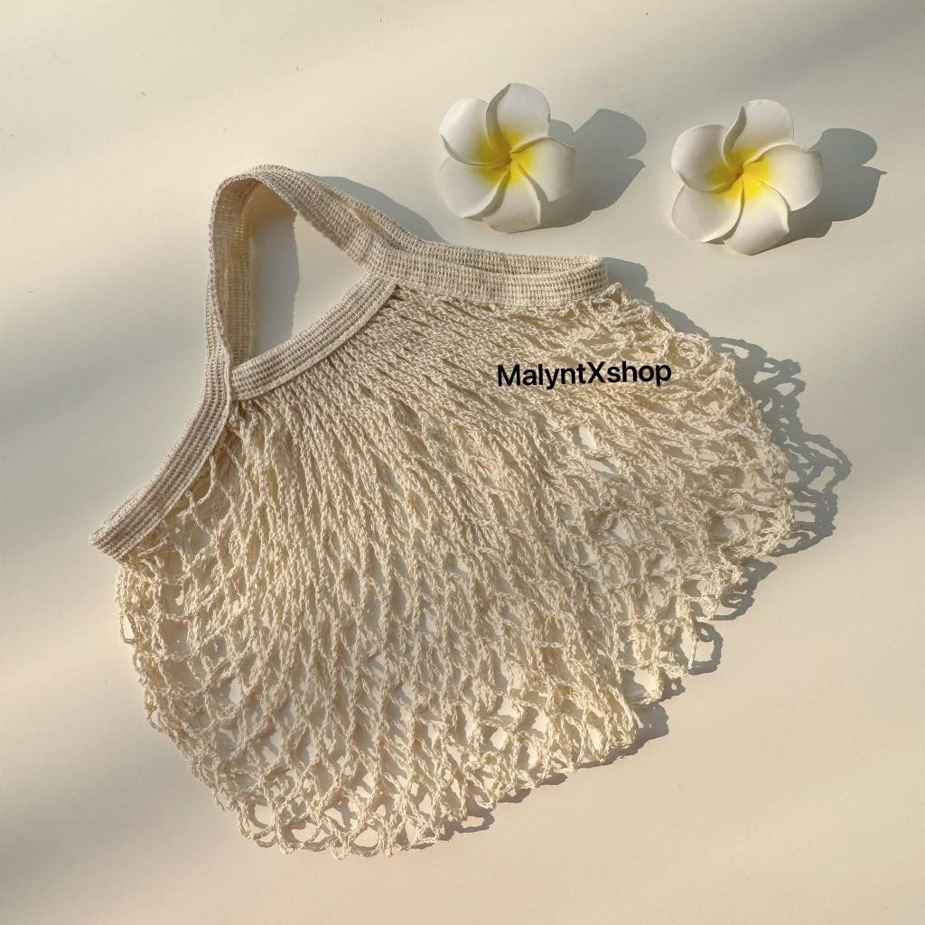 กระเป๋าไปทะเล ดีเทลผ้าตาข่าย สะพายข้าง สีขาวครีม สไตล์มินิมอล