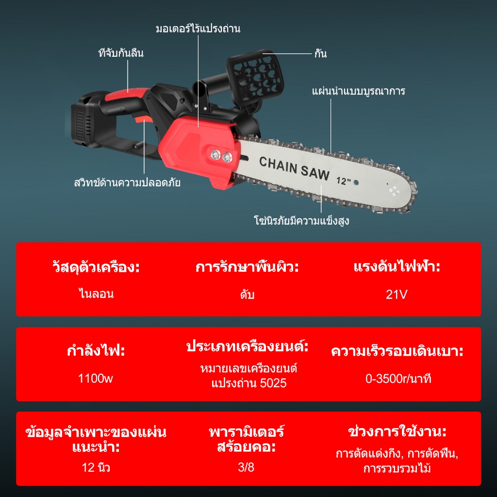 ... กดสวิตช์อัตโนมัติเพื่อเปิดเครื่อง ตาข่ายกระจายความร้อนกันฝุ่นช่วยป้องกันวัตถุแปลกปลอมเข้าสู่มอเตอร์และกระจายความร้อนได้อย่างมีประสิทธิภาพโดยไม่ทำให้ตัวเครื่องไหม้ ข้อมูลจำเพาะ: วัสดุของตัวเครื่อง: ไนลอน การรักษาพื้นผิว: การชุบแข็ง แรงดันไฟฟ้า: 21V กำลังไฟ: 1100W ประเภทมอเตอร์: มอเตอร์ไร้แปรงถ่าน 5025 ความเร็วรอบเดินเบา: 0-3500r/min (ความเร็วเฟือง) ความเร็วโซ่: 8.0m/s ข้อกำหนดโซ่: 3/8 ข้อมูลจำเพาะของแผ่นนำ: 12 นิ้ว เส้นผ่านศูนย์กลางการตัดสูงสุด: 285 มม ขอบเขตการใช้งาน: การตัดแต่งกิ่ง, ฟืนฟืน, การตัดไม้ เคล็ดลับ: ตัวเครื่องไม่รวมแบตเตอรี่เครื่องชาร์จ หมายเหตุ: เนื่องจากจอภาพและเอฟเฟกต์แสงที่แตกต่างกันสีที่แท้จริงของรายการอาจแตกต่างจากสีที่แสดงในภาพเล็กน้อย โปรดเผื่อความคลาดเคลื่อนในการวัด 1-3 มม. เนื่องจากการวัดด้วยตนเอง ขอขอบคุณสำหรับความเข้าใจของคุณ! รายการบรรจุ: โฮสต์*1 แผ่นนำขนาด 12 นิ้ว * 1 โซ่ 12 นิ้ว*1 ที่จับ*1 แผ่นกั้นความปลอดภัย*1 ประแจ*1 คู่มือภาษาอังกฤษ*1