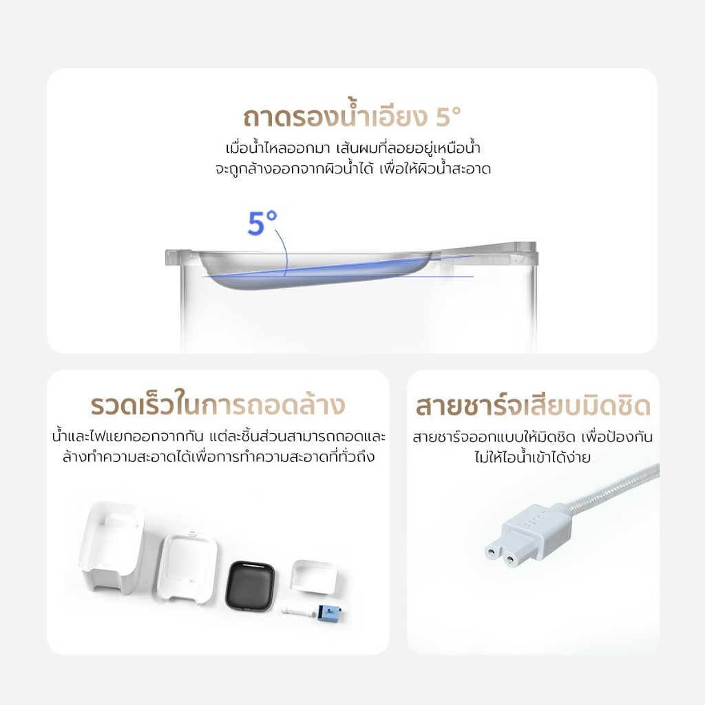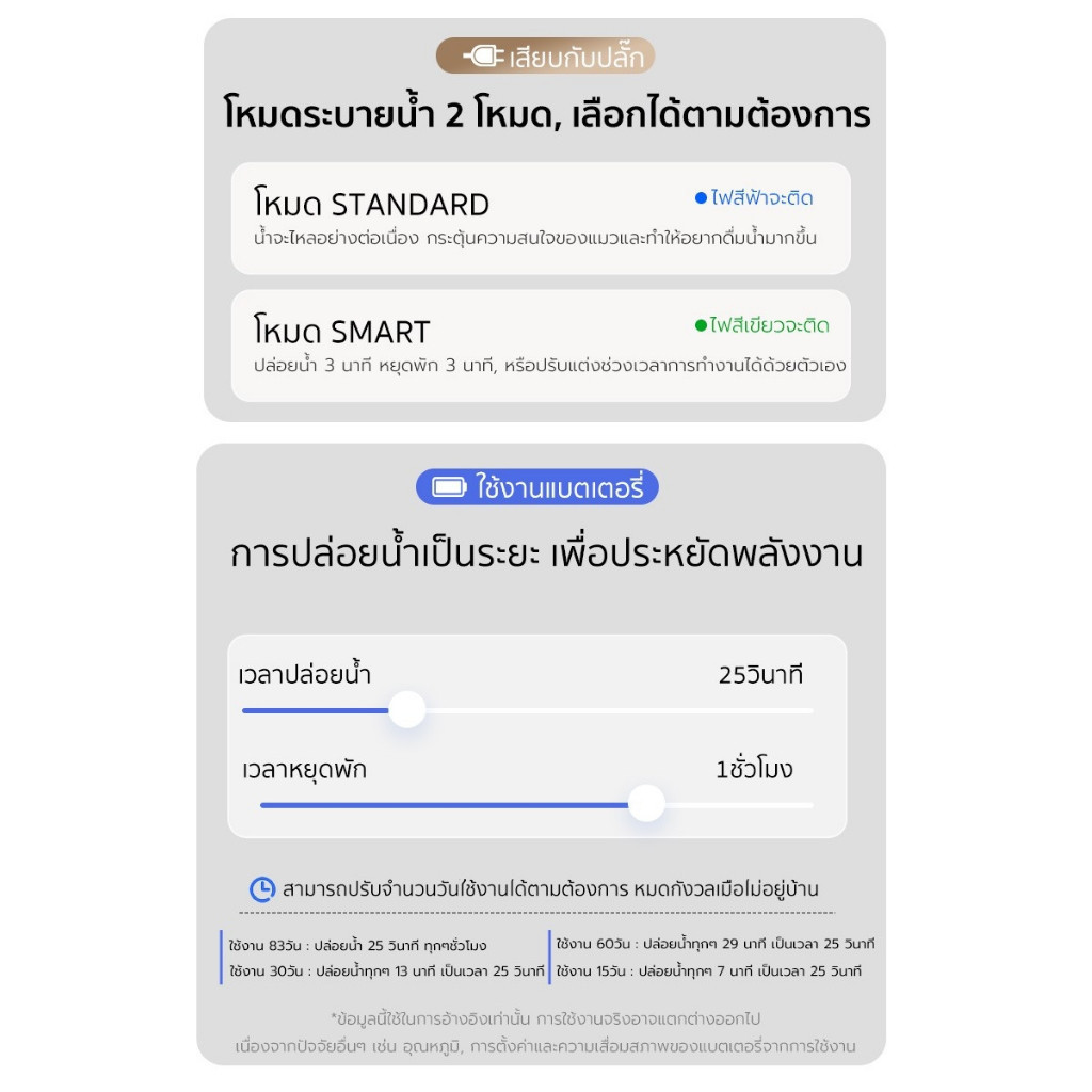 ... หม่ RECT ให้เรามอบน้ำเพื่อสุขภาพที่ดีแก่สัตว์เลี้ยงคุณ 📍อิสระทุกการใช้งานจะใช้แบบเสียบสายหรือไร้สายก็ได้ ไม่มีขีดจำกัดอีกต่อไป 📌เน้นย้ำเรื่องการใช้งาน : 1.ใช้งานแบบเสียบปลั๊กตลอดจะสามารถใช้งานได้ทั้ง 2 โหมด 2.ใช้งานแบบไร้สายจะใช้งานได้แค่โหมดเดียว โหมด Smart (น้ำพุพุ่งสลับกับหยุดพัก) รายละเอียดเพิ่มเติม : ▪️ปรับความถี่ในการจ่ายน้ำได้เพื่อยืดเวลาของแบตเตอรี่ให้ใช้ได้นานสูงสุด 83 วัน ▪️เสียงเบาเพียง26 เดซิเบลเป็นการออกแบบให้น้ำไหลชิดขอบของตัวถัง ทำให้ไม่มีเสียงน้ำกระทบกัน ▪️ให้น้ำสะอาด ปลอดภัยยิ่งขึ้น ด้วยการอัพเกรดเป็นปั๊ม UVC (ซื้อแยก) ▪️ชามสแตนเลสเคลือบเทฟลอน ลดการเกิดคราบสะสม ให้การล้างทำความสะอาดเป็นเรื่องง่าย ▪️แบตเตอรี่และปั๊มน้ำแยกส่วนออกจากกัน ปลอดภัย ทำความสะอาดง่าย ▪️บำรุงรักษาง่ายและราคาถูกกว่าการซ่อมทั้งชุด ▪️โหมดการทำงาน 2 โหมด คือ 1.โหมด Normal = ปั๊มน้ำทำงานตลอดเวลา 2.โหมด Smart = กำหนดเวลาการทำงานของปั๊มน้ำเองได้ ✅รับประกันศูนย์ไทย 1 ปี *** ไม่มีอะแดปเตอร์แถมให้ค่ะ *** รายละเอียดผลิตภัณฑ์ : 1.วัสดุ : ABS, สแตนเลส 304 2.ขนาด : 171x265x191 มิลลิเมตร (กxยxส) 3.ความจุ 3 ลิตร น้ำหนัก 1.2 กิโลกรัม 4.ความจุแบตเตอรี่ 5,000 mAh 5.เชื่อมต่อ : ผ่านบลูทูธ 6.เหมาะกับ : แมวหลายตัวและสุนัข ⚙️เงื่อนไขการรับประกันสินค้า⚙️ **กรุณาถ่ายคลิปวีดีโอก่อนแกะสินค้าและขณะแกะสินค้าทุกครั้งนะคะ** เก็บกล่อง คู่มือสินค้า และอุปกรณ์ต่างๆ ของทางร้าน อย่างน้อย 15 วัน เพื่อเป็นหลักฐานและใช้ในการรับประกันสินค้า ⚠️การรับประกันสินค้า ➛ระยะเวลารับประกันสินค้า ระยะรับประกันสินค้าตามเงือนไขสินค้า(สินค้าแต่ละรุ่นระยะเวลาประกันไม่เท่ากัน)หากสินค้ามีปัญหาภายในระยะเวลารับประกัน ส่งซ่อมค่าแรงและค่าอะไหล่ฟรี ➛ค่าส่ง ในกรณีไม่เกิน 15วัน ทางร้านจะรับผิดชอบค่าส่งไปและกลับหากเกิน15วันลูกค้ารับผิดชอบค่าส่งเองทั้ง ไป-กลับ หรือนำมาเข้าศูนย์ Service ของทางร้านเองได้ ➛ระยะเวลาการแก้ไขงาน 1.กรณีซ่อมศูนย์ Service ไทย ระยะเวลาประมาณ 7-14 วัน 2.กรณีทางศูนย์แก้ไขไม่ได้จำเป็นที่จะต้องส่งซ่อมต่างประเทศระยะเวลาประมาณ 45-90 วัน ➛การรับประกันอะไหล่ที่เปลี่ยน หากมีการเปลี่ยนอะไหล่ทางศูนย์ Service ของร้าน จะรับประกันอะไหล่ชิ้นนั้น 30 วัน ⚠️การตรวจสอบรับสินค้า 1.หลังได้รับสินค้ากรุณาตรวจสอบทั้งภายนอกและภายใน หากทางร้านส่งผิดกรุณาไม่แกะสินค้าและติดต่อทางร้านทันที 2.ทดสอบการใช้งานสินค้าเบื้องต้น เช่น ทดสอบปุ่มกด, การทำงานของเครื่อง 3.เมื่อพบสินค้ามีปัญหารบกวนแจ้งทางร้านภายใน 3 วัน ⚠️ขั้นตอนการแจ้งเมื่อสินค้