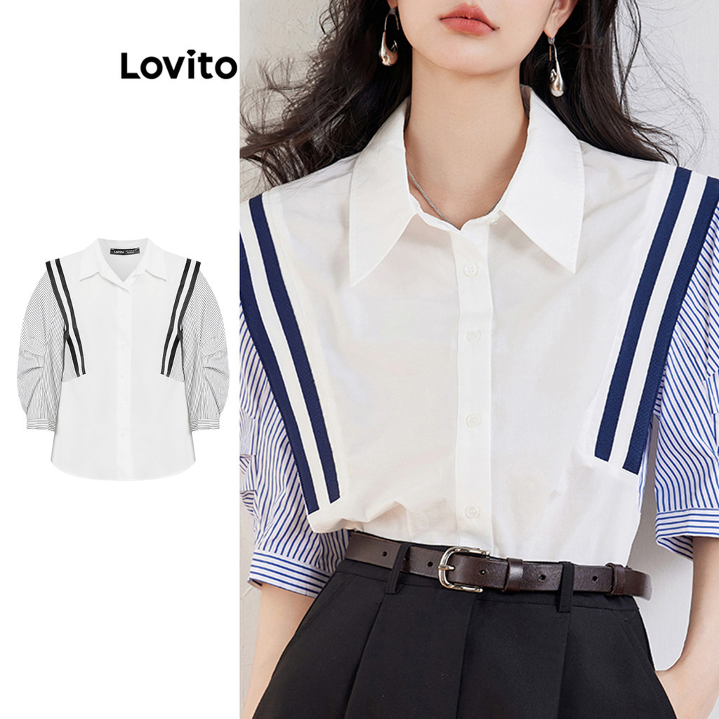Lovito เสื้อเบลาส์ผู้หญิง กระดุุมด้านหน้า คัลเลอร์บล็อก ลายทาง สไตล์ลำลอง LNE58290(หลากสี)