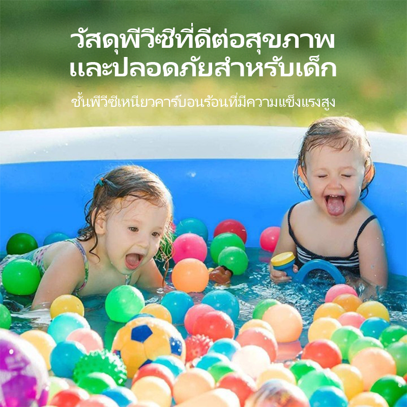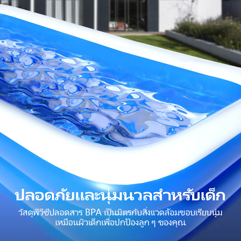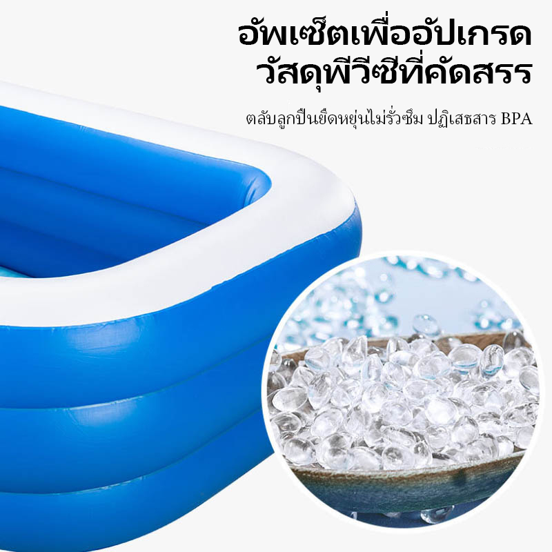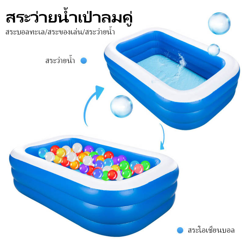 ... ⛔️กรุณาอ่านรายละเอียดให้ครบก่อนสั่งนะคะ⛔️ ทำให้ช่วงฤดูร้อนเย็นสบายขึ้น! 🌞🏊♀️ สระว่ายน้ำที่เรามีคือตัวเลือกที่ดีที่สุดสำหรับคุณ! 💦💙 ดีไซน์ที่เบาสะดวกในการพกพา ทำให้คุณสามารถสนุกกับน้ำได้ทุกที่ทุกเวลา. 🌞🏊♀️ วัสดุที่ดีและป้องกันการรั่วซึมที่มีคุณภาพสูง ให้ความทนทานในระยะเวลาที่ยาวนาน. 💦💙 พื้นที่กว้างขวางและสบายโดยรอบ ทำให้คุณสามารถว่ายน้ำไปพร้อมกับครอบครัวและเพื่อนได้อย่างสะดวกสบาย. 🌞🏊♀️ ดีไซน์ที่เป็นเอกลักษณ์และสีสันสดใส ทำให้สระว่ายน้ำเป็นจุดเด่นในบ้านของคุณ. 💦💙 ⚡️ข้อมูลสินค้า: 💁♀️รุ่น: สระ 1.2 M Pool ,1.2M Pool+Electric Pump+Swim ring 1.8 M Pool ,1.8M Pool+Electric Pump+Swim ring 2.1M Pool , 2.1M Pool+Electric Pump+Swim ring 3.05M Pool ,3.05M Pool+Electric Pump+Swim ring 💥【คุณสมบัติ】: - วัสดุผลิตจากไวนิลทนทานมาก - ความจุน้ำ : 990 ลิตร ** เล่นน้ำได้หลายคน ถ้าไม่ใส่น้ำใส่ลูกบอล เป็นบ่อบอลได้ ** สระว่ายน้ำพองได้ง่าย ปล่อยลมออกและจัดเก็บได้ง่ายหลังใช้งาน สระว่ายน้ำสำหรับครอบครัวเหมาะสำหรับทั้งครอบครัวมาสนุกด้วยกัน สระในบ้านมีผนังกว้างพิเศษทำจากไวนิลที่ทนทาน แหวน 3 ห่วงช่วยป้องกันการสูญเสียน้ำเมื่อปีนเข้าและออกจากสระ 👉【ข้อควรระวังการใช้ผลิตภัณฑ์】 * ใช้บนพื้นเรียบไม่มีแรงเสียดทานและวัตถุมีคมมากเกินไป *อย่าเป่าลมมากเกินไป *ขอแนะนำให้ทิ้งไว้ 30 นาทีถึง 1 ชั่วโมงหลังจากเติมน้ำแล้วเติมน้ำหลังจากแน่ใจว่าไม่มีการรั่วไหลของอากาศ *ห้ามเกินระดับสระชั้น 2 * เมื่อใช้และจัดเก็บผลิตภัณฑ์ พยายามหลีกเลี่ยงการสัมผัสกับอุณหภูมิสูงกว่า 80°C *หลังจากได้รับสินค้าแล้ว ให้เป่าลมและปล่อยทิ้งไว้ 3-5 ชั่วโมง หากปล่อยลมภายในสองสามชั่วโมง โปรดตรวจสอบรอยรั่วและแจ้งภาพการรั่วที่ชัดเจนให้เราทราบผ่านแชท (ไม่ต้องเติมน้ำ). *หากสินค้ามีปัญหากรุณาแจ้งผู้ขาย (ไม่ต้องเติมน้ำ) 👉คุณสมบัติ #สระเป่าลม ทำความเข้าใจสินค้าเป่าลม สระน้ำเป่าลม ***ขนาดสินค้าที่โชว์หน้ากล่อง เป็นขนาดที่เป่าจากโรงงาน ด้วยที่สูบลมตัวใหญ่แรงลมเยอะ / เมื่อ ลค เป่าจริง จะเป่าด้วยที่สูบลมเล็ก แรงลมไม่มาก จะไม่ได้แข็งตึงขนาด รง เป่านะคะ ขนาดจึงอาจจะไม่เป๊ะตามหน้ากล่อง ขนาดจึงขึ้นอยู่กับการเป่าลมของแต่ละบ้านด้วยค่ะ แต่การใช้งานจริงเราไม่สามารถเป่าให้แข็งตึงได้เพราะเมื่อเราใส่น้ำเล่น แรงดันจะดันสระให้สระแตกง่าย หากสระแข็งตึงเกินไปค่ะ 👉ข้อแนะนำ การใช้งานเครื่องสูบลมไฟฟ้า เนื่องจากเครื่องเป่าลมสระน้ำเป็นแบบไดเวอร์เล็ก ดังนั้นเวลาเป่าลมเครื่องจะร้อนเร็ว ถ้าเครื่องร้อนต้องพักเครื่องสักพักแล้วจึงใช้งานต่อนะคะ ห้ามใช้ต่อเนื่องเพราะอาจทำให้เครื่องเป่าลมช้