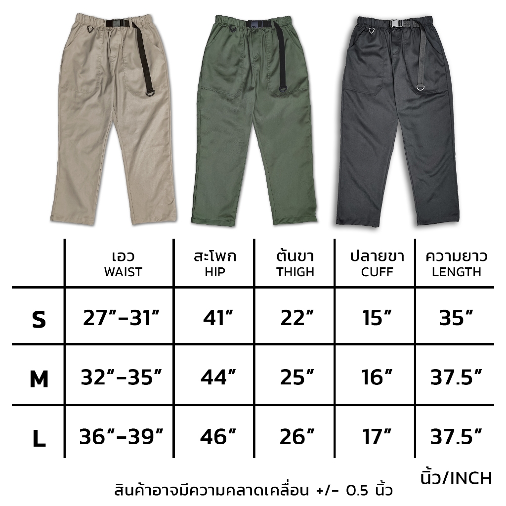 ... - กระเป๋าหน้าใช้เนื้อผ้าเดียวกับตัวกางเกง เย็บขึ้นมาเป็นกระเป๋า แข็งแรง และลึก ใส่ของได้เยอะ ไม่ขาดทะลุ - มีห่วงอเนกประสงค์ ด้านหน้า ผลิตจากพลาสติกเนื้อเหนียว แข็งแรง นายแบบสูง 185 ใส่ไซส์ M เอว 27- 32 นิ้ว แนะนำ SIZE S (เอวเวลายืดสุดได้ถึง 38 นิ้ว) เอว 33- 35 นิ้ว แนะนำ SIZE M (เอวเวลายืดสุดได้ถึง 42 นิ้ว) เอว 36- 39 นิ้ว แนะนำ SIZE L (เอวเวลายืดสุดได้ถึง 45 นิ้ว) เช็ครายละเอียดเพิ่มได้ที่ตารางขนาด อยู่ภาพสุดท้าย ***สลักเข็มขัด สามารถปรับความยาวได้อิสระนะครับ เหมือนสายของเป้ครับ ไม่อึดอัดแน่นอน****