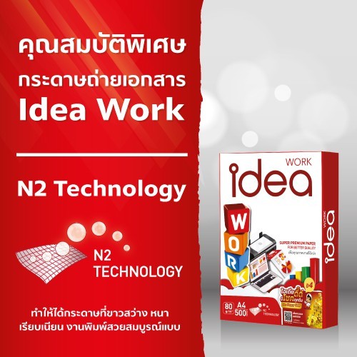Idea Work “กระดาษถ่ายเอกสาร 80 แกรม เพื่อคุณภาพงานที่ดีกว่า” สำหรับลูกค้าที่ต้องการงานพิมพ์สวย คมชัด Idea Work นวัตกรรมกระดาษคุณภาพ Super Premium ที่ช่วยยกระดับงานพิมพ์ขึ้นอีกระดับ ด้วย N2 Technology ทําให้ได้กระดาษที่ขาวสว่าง หนา และ มีผิวสัมผัสเรียบเนียนยิ่งขึ้น ช่วยทําให้งานพิมพ์คมชัด สวย สมบู