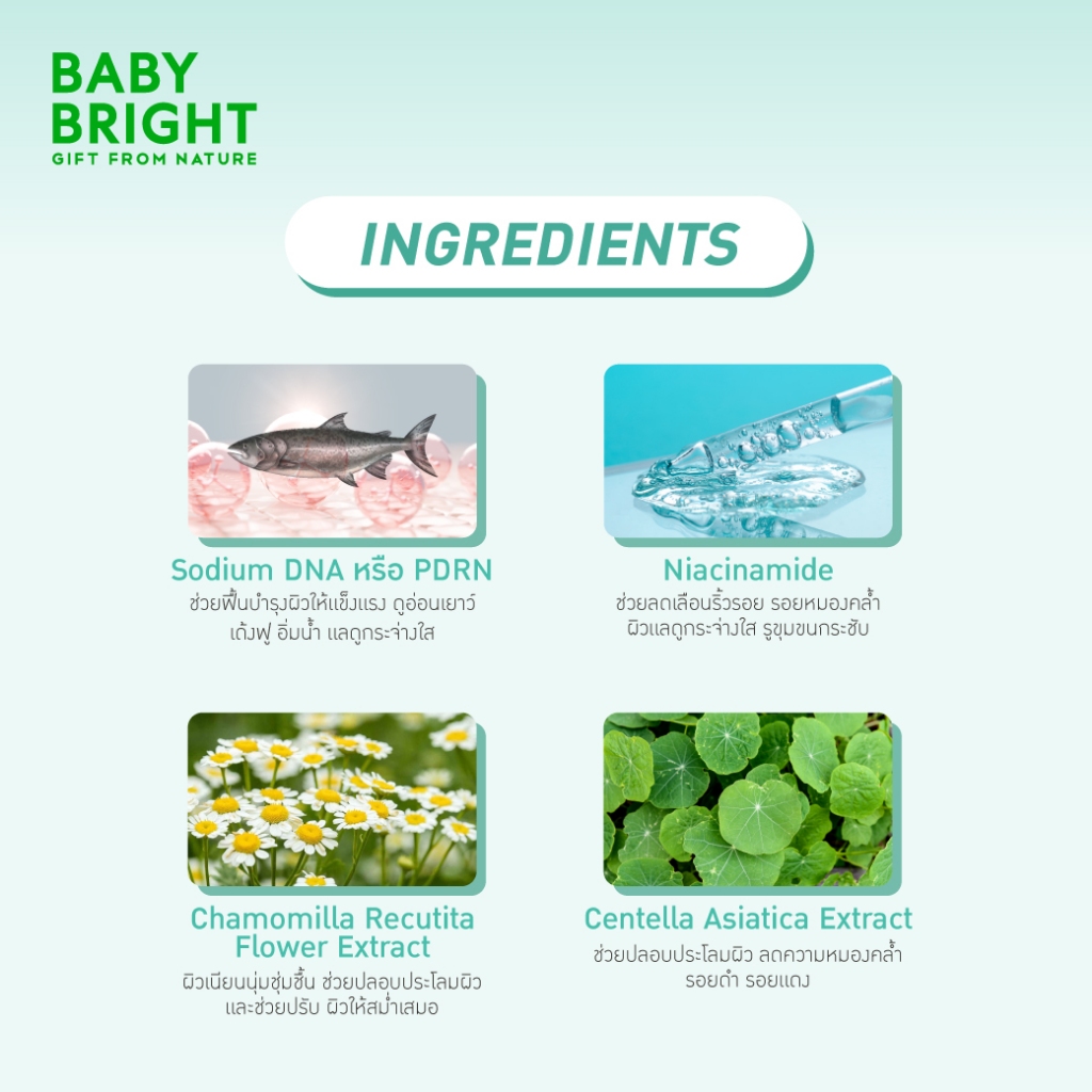 รายละเอียดสินค้า _x000D_ เติมความชุ่มชื้นให้ผิวอิ่มฟูเนียนใสด้วยเบบี้ไบร์ท รีจูไลท์ ฟิล-ลาเจน ไฮโดรเจล มาสก์ แผ่นมาสก์ไฮโดรเจลแยกส่วน มาพร้อมนวัตกรรมการฟื้นฟูผิวด้วยสารสกัด Polydeoxyribonucleotide (PDRN) หรือสารสกัด Sodium DNA จากปลาแซลมอน 0.5% สู่ผลิตภัณฑ์รีจูไลท์ไฮโดรเจลมาสก์ ตรงเข้าฟื้นบำรุงผิวห