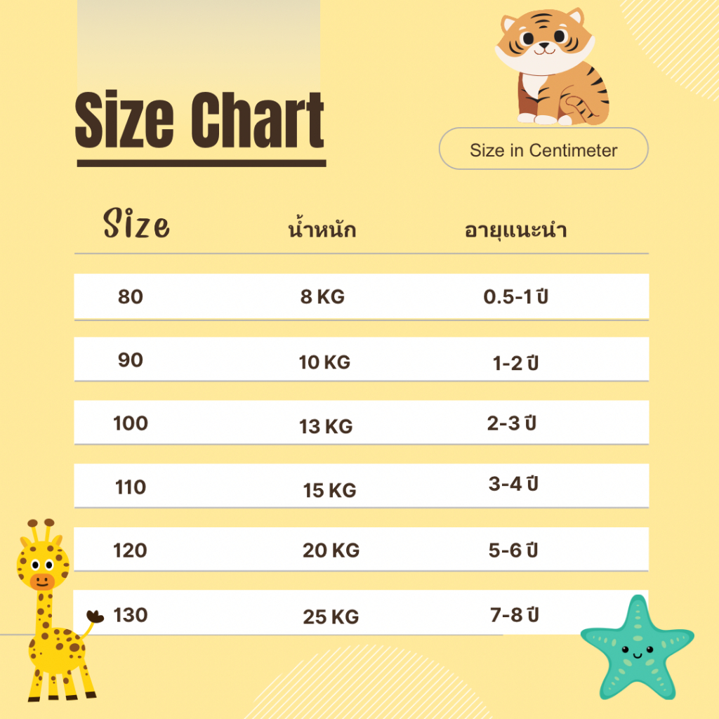 ขนาด 80: น้ำหนักอ้างอิง: 8 กก. อายุที่แนะนำ: 0.5-1 ปี ขนาด 90: น้ำหนักอ้างอิง: 10 กก. อายุที่แนะนำ: 1-2 ปี ขนาด 100: น้ำหนักอ้างอิง: 13 กก. อายุที่แนะนำ: 2-3 ปี ขนาด 110: น้ำหนักอ้างอิง: 15 กก. อายุที่แนะนำ: 3-4 ปี ขนาด 120: น้ำหนักอ้างอิง: 20 กก. อายุที่แนะนำ: 5-6 ปี ขนาด 130: น้ำหนักอ้างอิง: