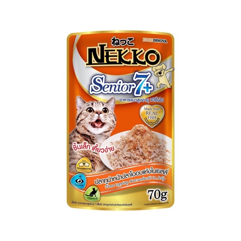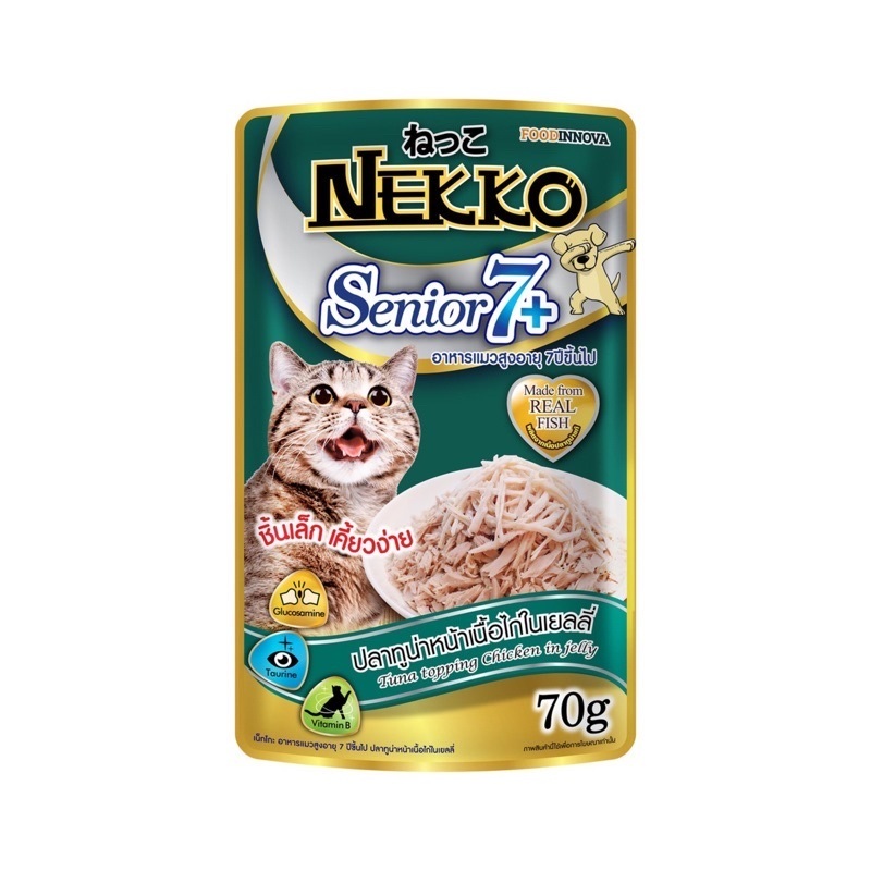 Nekko เน็กโกะ อาหารเปียก สำหรับแมวสูงอายุ 7+ ขึ้นไป ขนาด 70 กรัม มี 4 รสชาติ 😸 ปลาทูน่าหน้าเนื้อไก่ในเยลลี่ 😽 ปลาทูน่าในเยลลี่ 😻 ปลาทูน่าหน้าปลาโออบแห้งในเยลลี่ 😺 ปลาทูน่าหน้าปลาแซลมอนในเยลลี่ วัตถุดิบที่ใช้เป็นส่วนผสมอาหารสัตว์ ทูน่า, ผงเยลลี่, สารปรุงแต่งรส, แป้งมันสำปะหลังดัดแปร, ปลาทู
