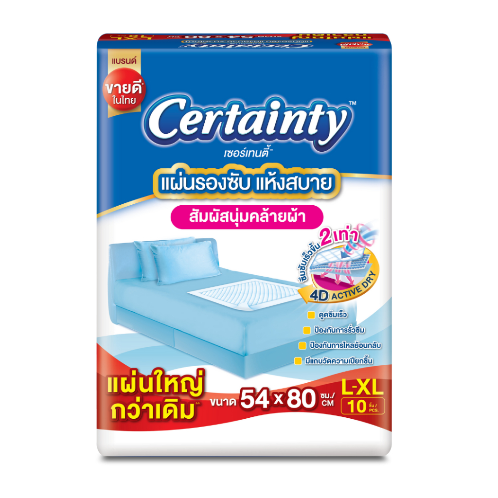 เซอร์เทนตี้ แผ่นรองซับ ปูรองซับบนเตียง เพื่อป้องกันการเปรอะเปื้อน และลดโอกาสการเกิดแผลกดทับ เซอร์เทนตี้ แผ่นรองซับ ขนาดใหญ่ แบรนด์ขายดีในไทย* แผ่นรองซึมซับขนาดใหญ่ ป้องกันการเปรอะเปื้อนที่นอน เหมาะสำหรับคนไข้หลังการผ่าตัด ผู้ป่วยติดเตียง มารดาหลังคลอดบุตร คุณสมบัติสินค้า - เทคโนโลยี 4D