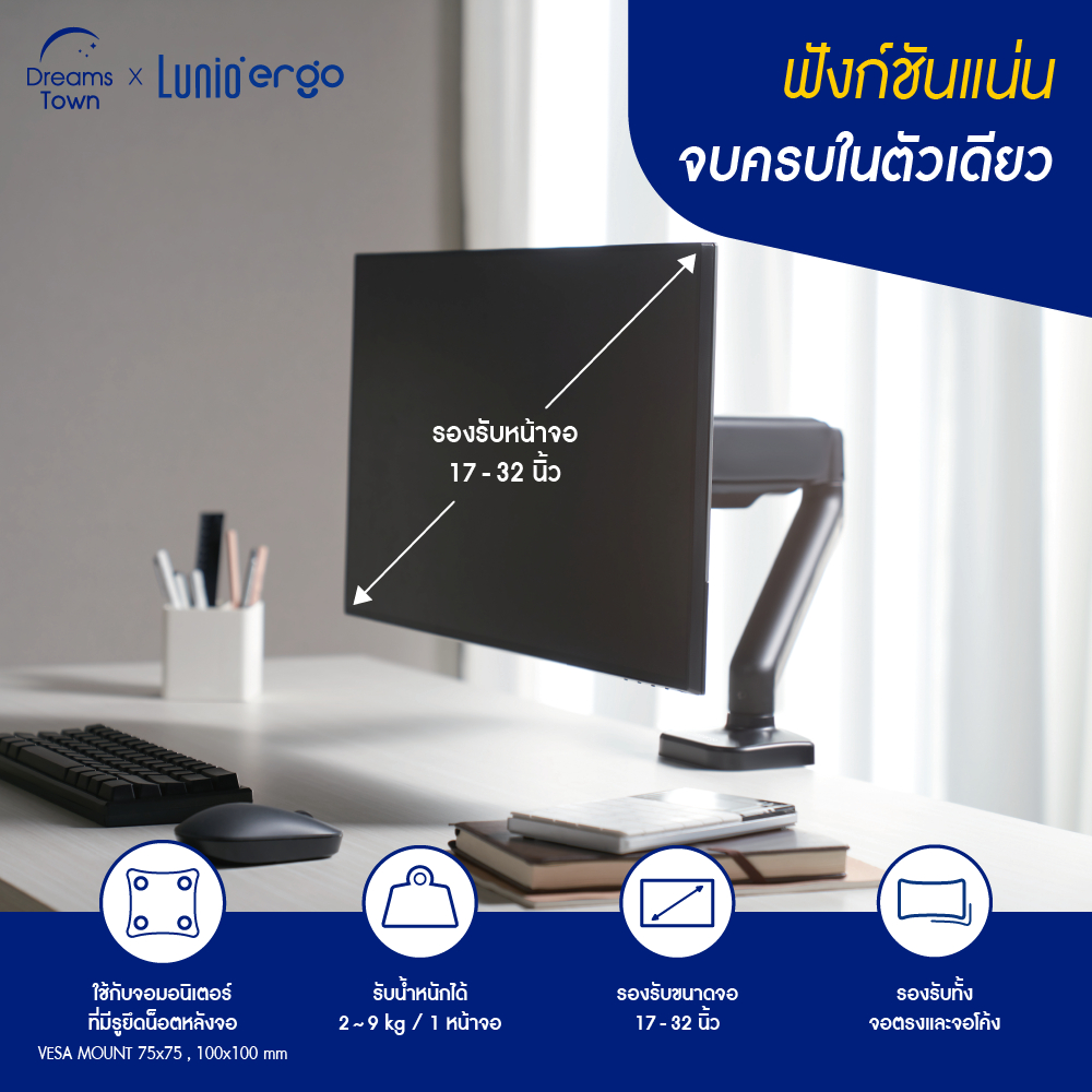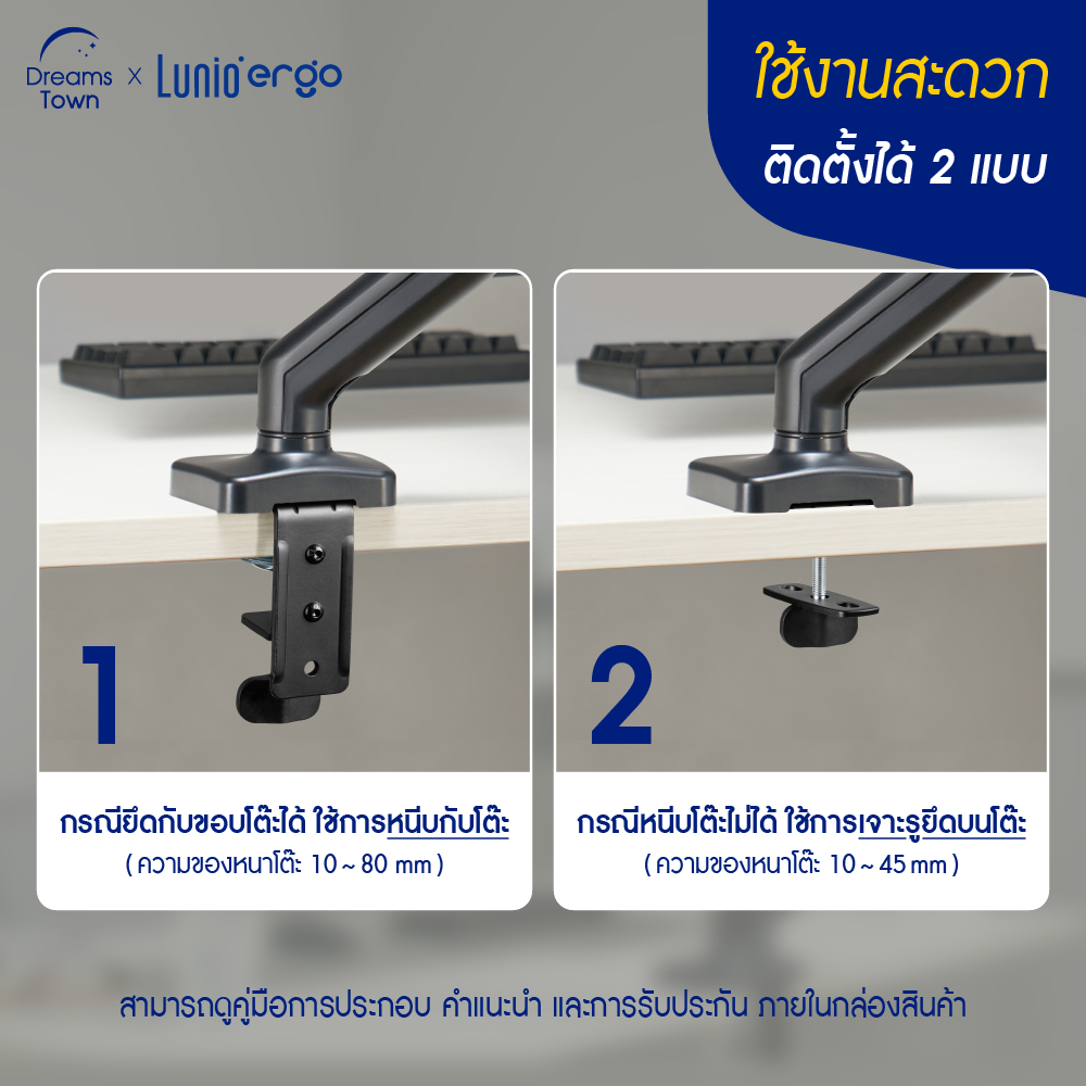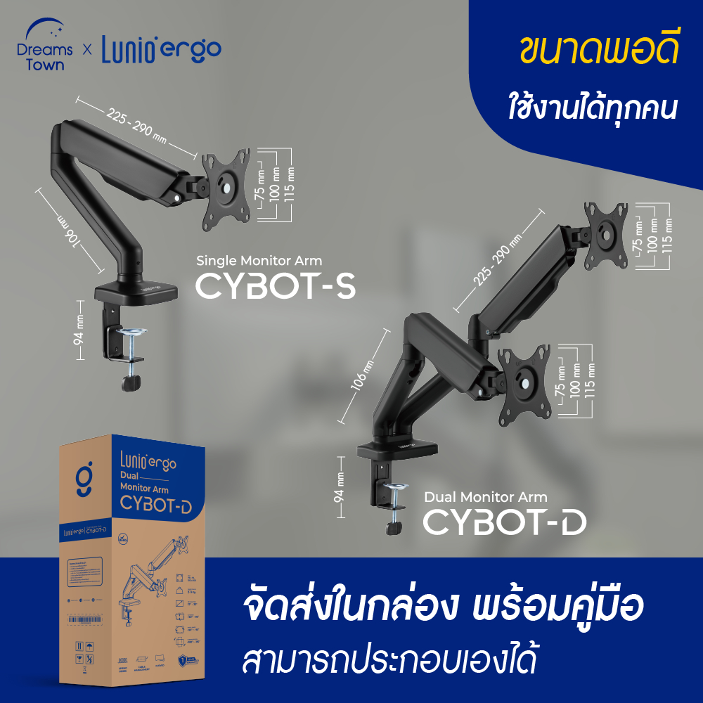 ... ่ายๆ ในราคาเบ๊าเบา✨ 📢 พิเศษ! ผ่อน 0% นานสูงสุด 10 เดือน (Spaylater, บัตร AEON, ธนาคารไทยพาณิชย์, ธนาคารกรุงไทย, ธนาคารกสิกร, ธนาคารกรุงเทพ, ธนาคารกรุงศรีอยุธยา, กรุงศรีเฟิร์สช้อยส์, ธนาคารยูโอบี, ธนาคารซิตี้แบงก์) 🚚 จัดส่งฟรี ทั่วประเทศ โดยเลือกช่องทางการจัดส่งแบบ “Seller Own Fleet" 🎁 มีบริการเก็บเงินปลายทาง 💫 สินค้ารับประกันโครงสร้าง 1 ปี ตามนโยบายบริษัท 👍 จัดส่งในรูปแบบที่นอนในกล่อง ติดตั้งสะดวก 📌 ลูกค้าสามารถเก็บเงินปลายทางได้ โดยเลือกช่องทางการจัดส่งแบบ “Standard Delivery” 🛏 บริการประกอบให้ เฉพาะในเขตกรุงเทพฯ และปริมณฑล โดยเลือกช่องทางการจัดส่งแบบ “Seller Own Fleet" และโปรดแจ้งทางแชท ----------------------------------------------------------------------------------------- 💙แขนจับจอ (ตัวจับจอ) Lunio Ergo รุ่น Cybot💙 คือ อุปกรณ์เสริมสำหรับโต๊ะทำงาน ที่ใช้ยึดจับหน้าจอคอมพิวเตอร์ ช่วยให้สามารถปรับระดับหน้าจอได้หลากหลายองศา ทั้งแนวตั้ง แนวนอน สูงต่ำ ปรับองศาจอมอนิเตอร์ได้หลากหลาย ช่วยลดปวดคอ บ่า ไหล่ จากการก้มมองจอคอมในมุมที่ต่ำ หรือ สูงเกินไป และเพิ่มพื้นที่การทำงานให้มากขึ้น 💙ส่วนประกอบหลักของแขนจับจอ (Monitor Arm) รุ่น Cybot💙 ⚙ ขาตั้ง (Base) เป็นส่วนที่ยึดแขนจับจอไว้กับโต๊ะทำงาน ⚙ แกนกลาง (Column) เป็นส่วนที่เชื่อมต่อขากับแขนจับจอ สามารถปรับความสูงได้ ⚙ แขนจับ (Arm) เป็นส่วนที่ยึดหน้าจอไว้ สามารถปรับความยาวและองศาได้ ⚙ แผ่นยึดหน้าจอ (VESA mount) เป็นแผ่นที่ใช้ยึดหน้าจอกับแขนจับจอ 💙ปรับระดับง่าย ได้ระยะจอที่เหมาะสม💙 👍 ปรับจอขึ้นลงได้ 16.5 - 41.5 cm 👍 ปรับจอเลื่อนเข้า-ออก 22.5 - 29.0 cm 👍 หมุนจอซ้าย-ขวาได้ 180° 👍 ปรับมุมก้ม-เงยได้ -90° ถึง+90° 👍 หมุนได้ 360° ปรับได้ทั้งแนวตั้งและแนวนอน 👍 Cable management มีช่องเก็บสายไฟให้ดูเรียบร้อย 👍 Mechanical Spring Monitor Arm สามารถปรับระดับความอ่อน-แข็งของสปริงได้ 💙ครอบคลุมทุกการใช้งานรองรับหน้าจอได้หลากหลาย💙 ✅ ใช้กับจอมอนิเตอร์ที่มีรูยึดน็อตหลังจอ VESA MOUNT 75x75 , 100x100 mm ✅ รองรับขนาดจอ: 17 - 32 นิ้ว ✅ รับน้ำหนักได้: 2~9 kg ต่อ 1 หน้าจอ 💙ข้อดีของการใช้แขนจับจอ (Monitor Arm) รุ่น Cybot💙 ⭐ ลดอาการปวดคอ บ่า ไหล่: ปรับหน้าจอให้อยู่ในระดับสายตา ช่วยให้กล้ามเนื้อคอผ่อนคลาย ลดอาการปวดเมื่อย ⭐ เพิ่มพื้นที่ทำงาน เก็บจอขึ้นจากโต๊ะ พื้นที่บนโต๊ะจะโล่งขึ้น ทำงานได้สะดวกขึ้น ⭐ เพิ่มประสิทธิภาพในการทำงาน: จัดวางจอหลายตัวให้ทำงานได้สะดวก ช่วยให้ทำงานได้คล่องตัวมากขึ้น ⭐ ป้องกันปัญหาสายตา: ปรับจอให้เอียงในมุมที่เหมาะสม ช่วยให้มองจอนานๆ โดยไม่ปวดตา 💙ตั้งตั้งได้ 2 แบบ💙 🔧 แบบที่ 1 หนีบกับโต๊ะ (ความหนาโต๊ะ 10~80mm) 🔧 แบบที่ 2 เจาะรูโต๊ะ (ความหนาโต๊ะ 10~45mm) *มีคู่มือภาษาไทย และประแจแถมให้ในกล่อง ติดตั้งง่าย ไม่