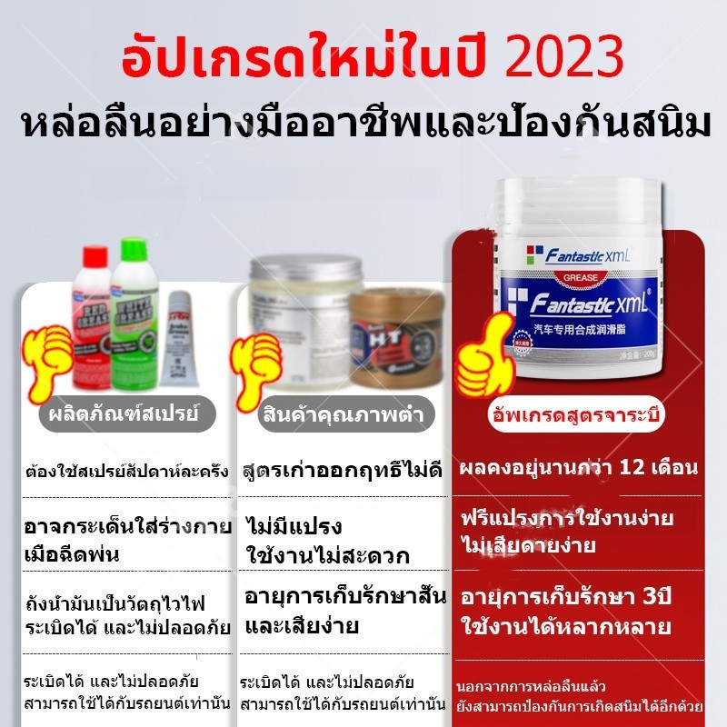 ... ้าของจาระบีสีขาว FantasticxmL กัน  จาระบีนี้ผลิตจากน้ำมันหล่อลื่นพื้นฐานและสารเติมแต่งคุณภาพสูง  มีการยึดเกาะและการซึมผ่านที่ดี  แรงเสียดทานและการสึกหรอระหว่างชิ้นส่วนเครื่องกลได้อย่างมีประสิทธิภาพ  ยืดอายุการใช้งานของเครื่อง  อย่างที่สอง  จาระบีสีขาว FantasticxmL ทนความร้อนได้ดีเยี่ยม  รักษาคุณสมบัติการหล่อลื่นให้มั่นคงที่อุณหภูมิสูงถึง 200°C  ตรวจสอบให้แน่ใจว่าเครื่องทำงานได้ตามปกติในสภาพแวดล้อมที่มีอุณหภูมิสูง  นี่เป็นสิ่งสำคัญมากสำหรับอุปกรณ์บางชนิดที่ต้องทำงานภายใต้สภาวะที่มีอุณหภูมิสูง  ป้องกันจาระบีไม่ให้ละลายหรือระเหยเนื่องจากอุณหภูมิสูงได้อย่างมีประสิทธิภาพ  ส่งผลให้ประสิทธิภาพในการหล่อลื่นลดลง นอกจากนี้   จาระบีสีขาว Fantastic xmL กันน้ำได้อย่างยอดเยี่ยม  แม้ในสภาพแวดล้อมการทำงานที่เปียกหรือน้ำท่วม  ก็ยังสามารถป้องกันน้ำไม่ให้ซึมเข้าสู่เครื่องกลและอุปกรณ์ได้อย่างมีประสิทธิภาพ  ลดการเกิดสนิมและการกัดกร่อนของชิ้นส่วน  รักษาเครื่องให้ทำงานได้อย่างตามปกติ จาระบีสีขาว FantasticxmL ให้การปกป้องการหล่อลื่นที่เชื่อถือได้  ลดแรงเสียดทานและการสึกหรอของส่วนประกอบเครื่องกล  ลดอัตราความล้มเหลวของอุปกรณ์  ยืดอายุการใช้งานเครื่อง  ฟังก์ชั่นการต้านทานความร้อนและกันน้ำทำให้เหมาะใช้สำหรับอุปกรณ์เครื่องกลในสภาพแวดล้อมที่มีอุณหภูมิและความชื้นสูงต่างๆ  และทำให้เครื่องทำงานได้อย่างมีเสถียรภายใต้สภาวะที่แย่ โดยสรุปแล้ว   จาระบีสีขาว Fantastic xmLเป็นสารหล่อลื่นประสิทธิภาพสูง  ทนความร้อนและกันน้ำได้สูงถึง 200°C  จุดขายคือให้การปกป้องการหล่อลื่นที่เชื่อถือได้  ยืดอายุการใช้งานเครื่อง  เหมาะสำหรับอุปกรณ์เครื่องกลในสภาพแวดล้อมที่เลวร้ายต่างๆ  ไม่ว่าคุณจะอยู่ในการผลิตภาคอุตสาหกรรมหรืองานซ่อมบำรุงส่วนบุคคล  จาระบีสีขาว Fantastic xmL จะให้การสนับสนุนการหล่อลื่นที่มีประสิทธิภาพและเชื่อถือได้แก่คุณ