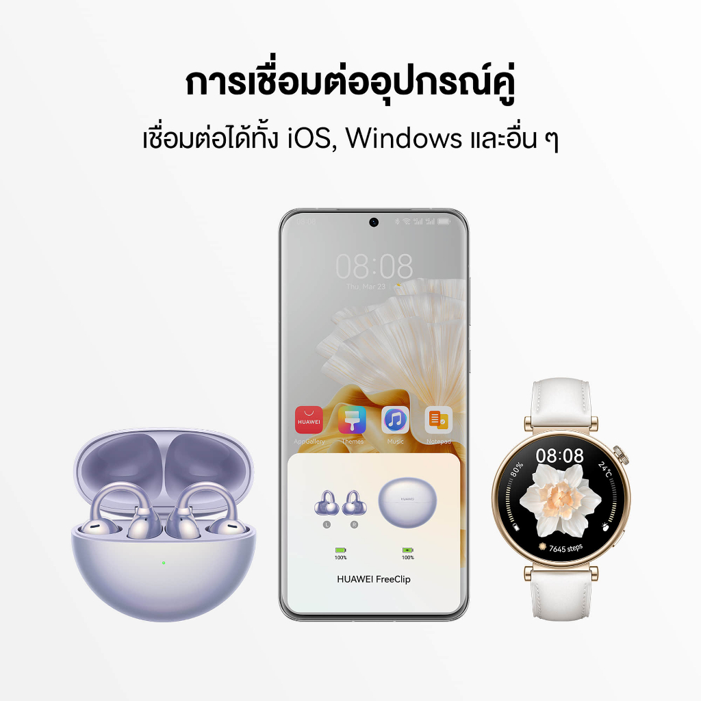 ฮาร์ดแวร์ WQ7036 เวอร์ชั่นบลูทูธ Bluetooth 5.3 บลูทูธโปรโตคอลที่รองรับ A2DP 1.3 Hands-free profile (HFP) 1.7 AVRCP 1.6 ช่วงความถี่ที่มีประสิทธิภาพสําหรับการเล่นเสียง 20 Hz–20 kHz A2DP codec AAC, SBC, L2HC, and LC3 คุณภาพการโทร HUAWEI FreeClip มีการนำไ