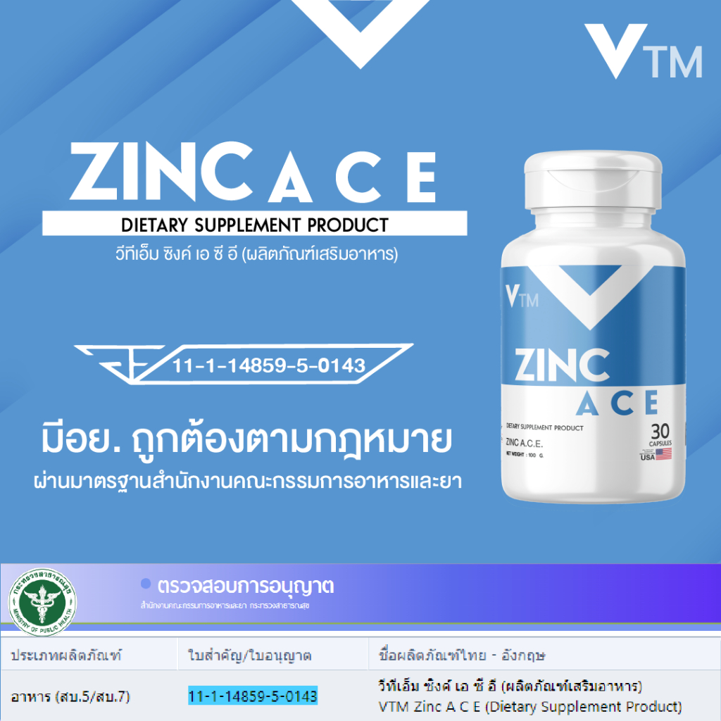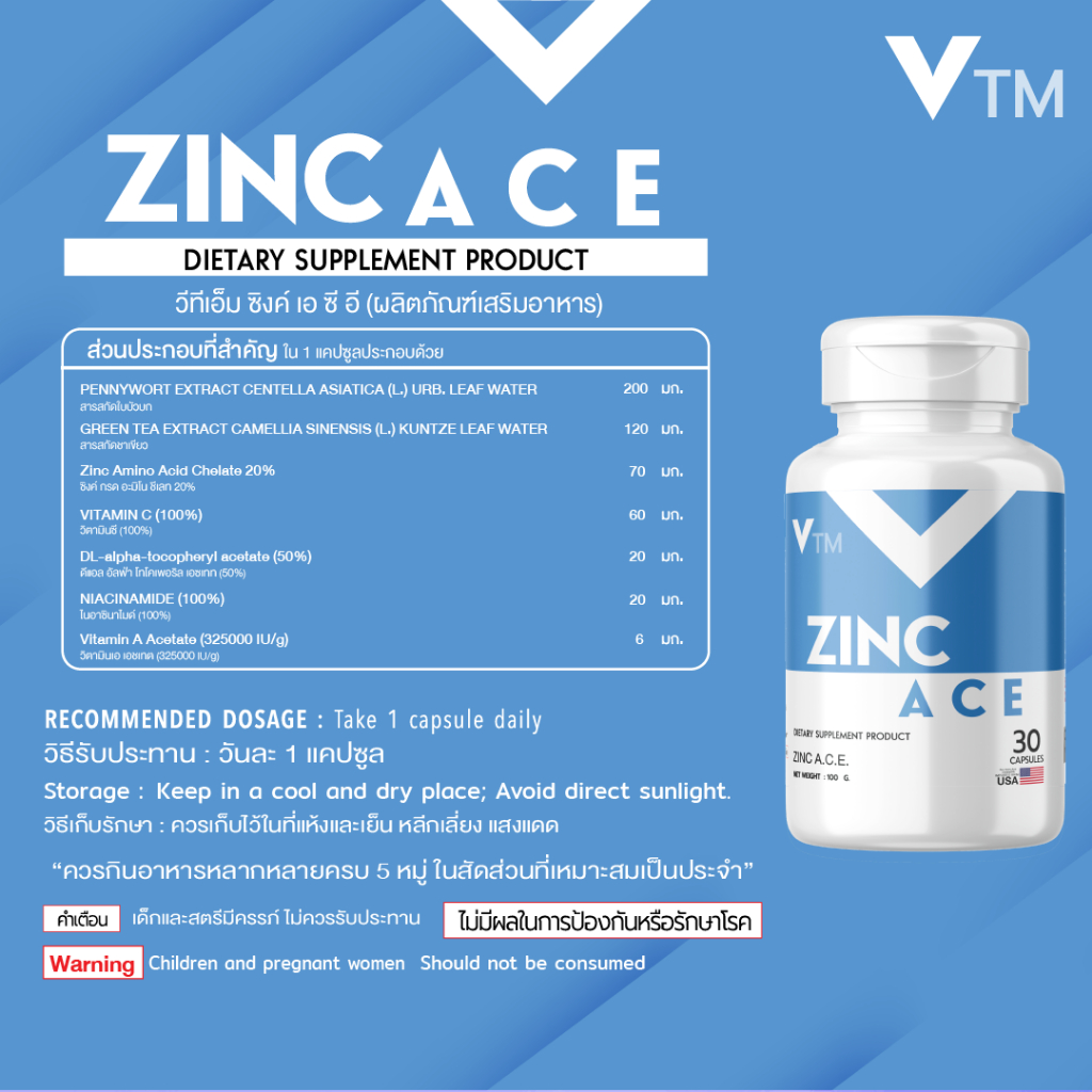... ่านั้น ✅ หากได้รับสินค้าไม่ครบ กรุณาส่งคลิปวีดีโอ ยืนยันทางเเชท ✅ หากไม่มีคลิปยืนยัน ร้านค้าขออนุญาตไม่รับผิดชอบทุกกรณี 🙏🏻🙏🏻 ขอบพระคุณลูกค้าทุกท่าน 🙏🏻🙏🏻 -------------------------------- VTM Zinc A C E (Dietary Supplement Product) วีทีเอ็ม ซิงค์ เอ ซี อี (ผลิตภัณฑ์เสริมอาหาร) #VTM Zinc A C E ช่วยลดสิว หน้าใส ผิวแข็งแรง เลข อย. จดแจ้ง 11-1-14859-5-0143 น้ำหนักสุทธิ : 13.6 กรัม ( 30 แคปซูล) วีทีเอ็ม ซิงค์ เอ ซี อี เน้นลดสิว หน้าเนียน บำรุงผิวใส ผิวแข็งแรง สารสกัดพรีเมี่ยม สารสำคัญ Zinc Amino Acid นำเข้าจาก USA เหมาะสำหรับคนเป็นสิว วีทีเอ็ม ซิงค์ เอ ซี อี Zinc งานวิจัยเผยว่า เป็นสารต้านอนุมูลอิสระ ปรับสมดุลของสารอนุมูลอิสระสาเหตุหนึ่งของการเกิดสิว และ ยังยับยั้งการเจริญเติบโตของแบคทีเรีย P. acnes รวมถึง ยับยั้งการทำงานของต่อมไขมันสาเหตุของการเกิดสิว สารสกัดชาเขียวมีคุณสมบัติต้านอักเสบที่ช่วยลดความอักเสบและบวมของสิว นอกจากนี้มีสารสกัดที่สำคัญ GREEN TEA EXTRACT สารสกัดชาเขียวมีคุณสมบัติต้านอักเสบที่ช่วยลดความอักเสบและบวมของสิว และ PENNYWORT EXTRAT (ชาเขียว) อยู่ใน #วีทีเอ็ม ซิงค์ เอ ซี อี ช่วยให้ผิวเต่งตึง สร้างเซลล์ผิวใหม่ ป้องกันการเกิดแผลเป็น และ มีฤทธิ์ในการสมานแผล # Zinc Amino A C E ✅ คนที่มีปัญหารอยสิวด่างดำจากสิว ✅ คนที่มีปัญหาหน้ามัน รูขุมขนกว้าง ✅ คนที่มีปัญหาหน้าหมองคล้ำ ผิวไม่เรียบเนียน ✅ ชะลอความเสื่อมเซลล์ผิว ✅ คนที่มีภาวะขาด Zinc ✅Ingredients ⭐️ PENNYWORT EXTRAT ⭐️ GREEN TEA EXTRACT ⭐️ Zinc Amino Acid Chelate ⭐️ Vitamin C 100% ⭐️ DL-alpha-tocophery acetate ⭐️ NIACINAMDE 100% ⭐️ Vitamin A Acetate ⭐️ EDIBLE GELATIN ⭐️ MAGNESIUM STEARATE ⭐️ SILICON DIOXIDE ⭐️ BRILLIANT BLUE FCF ✅วิธีรับประทาน : ⭐️ วันละ 1 แคปซูล แนะนำให้ทานหลังอาหาร ✅ ระบบประกันคุณภาพมาตรฐาน GHPs/ ISO สากล สำหรับการผลิตผลิตภัณฑ์เสริมอาหาร *อ่านคำเตือนในฉลากก่อนบริโภค ไม่มีผลในการป้องกันหรือรักษาโรค* ควรกินอาหารหลากหลายครบ 5 หมู่ในสัดส่วนที่เหมาะสมเป็นประจำ